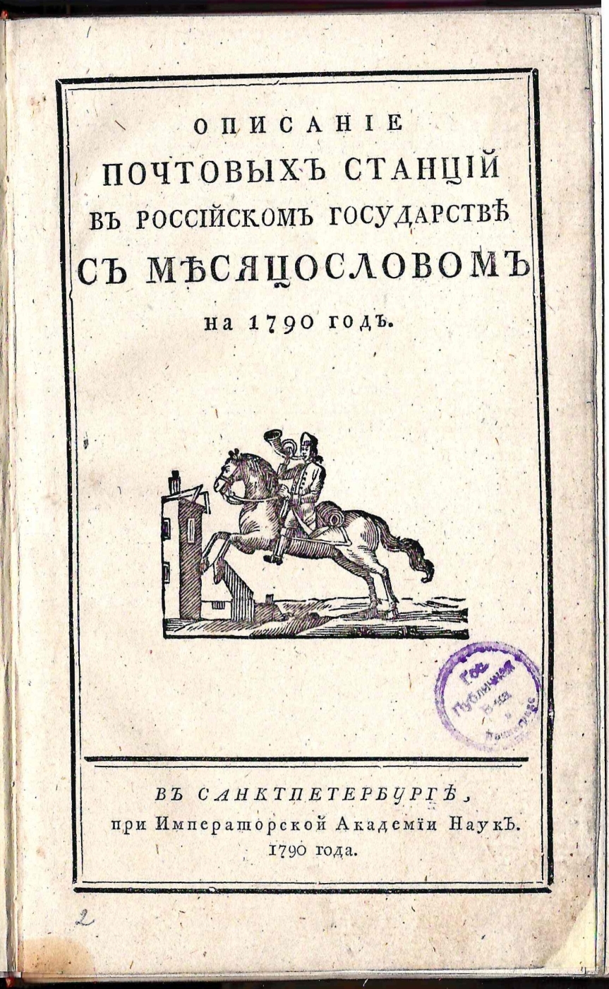 Описание почтовых станций в Российском государстве с месяцословом на 1790 год. — В Санктпетербурге: при Императорской Академии наук, 1790. — [4], 1-16, XVII-XVIII, 1-60, [2] с., [1] л. табл.; 8°