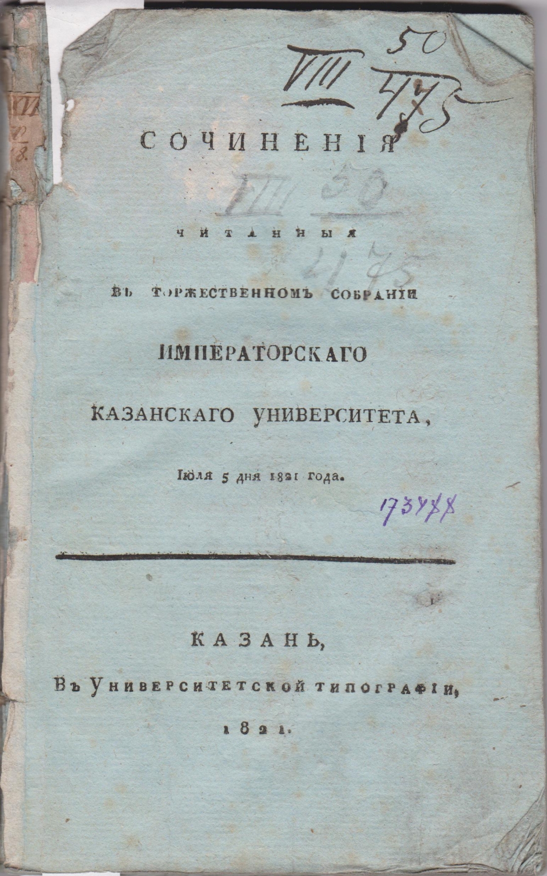 Сочинения читанныя в Торжественном собрании Императорскаго Казанскаго университета, июля 5 дня 1821 года. — Казань: В Университетской типографии, 1821. — [2], 1–101, [1], 102–132, [1] с.; 8°