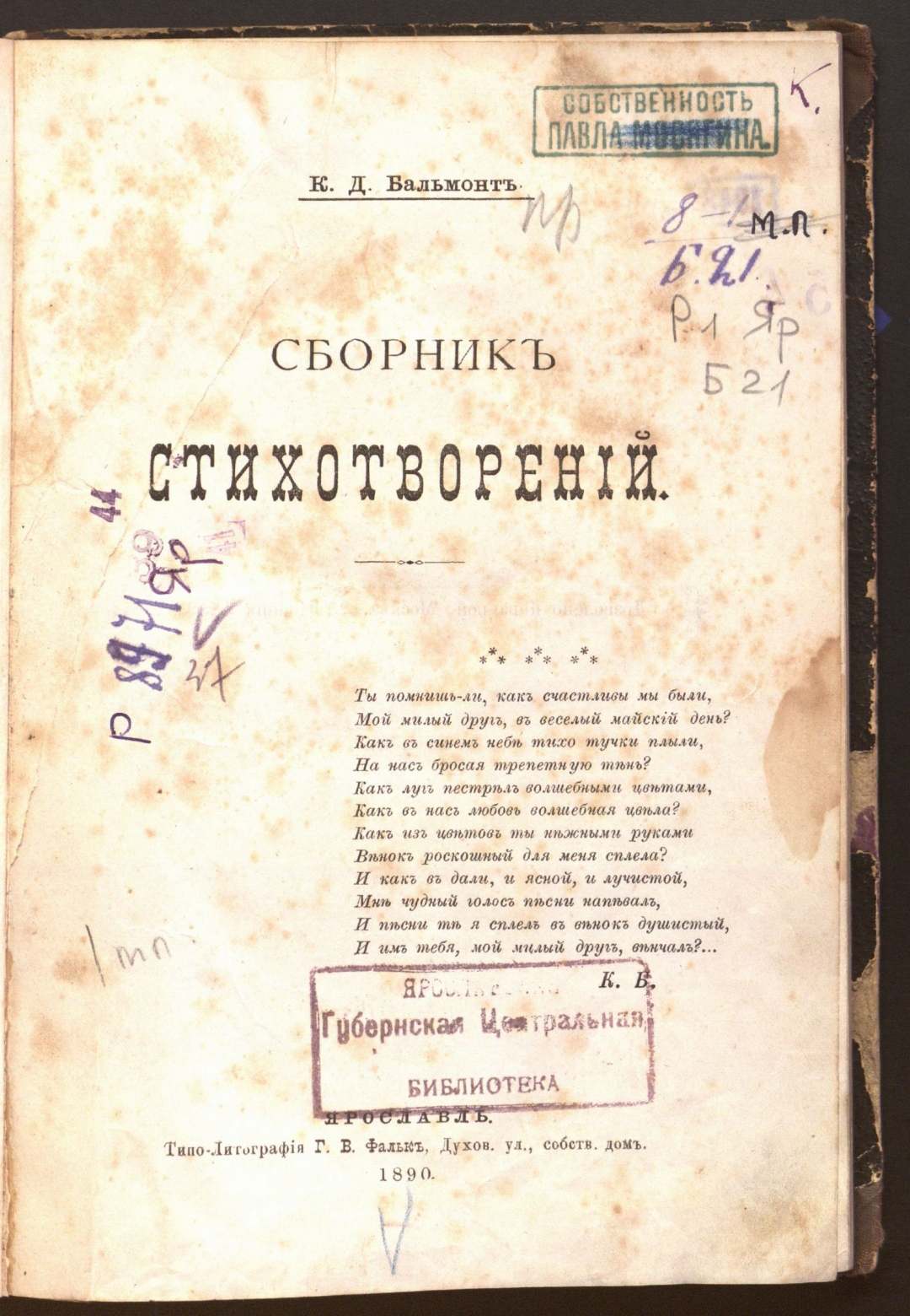 Сборник стихотворений / К. Д. Бальмонт. — Ярославль: Типо-Литография Г. В. Фальк, 1890. — 140, III, [1] с.; 22 см