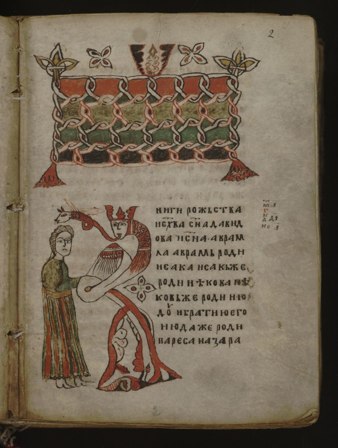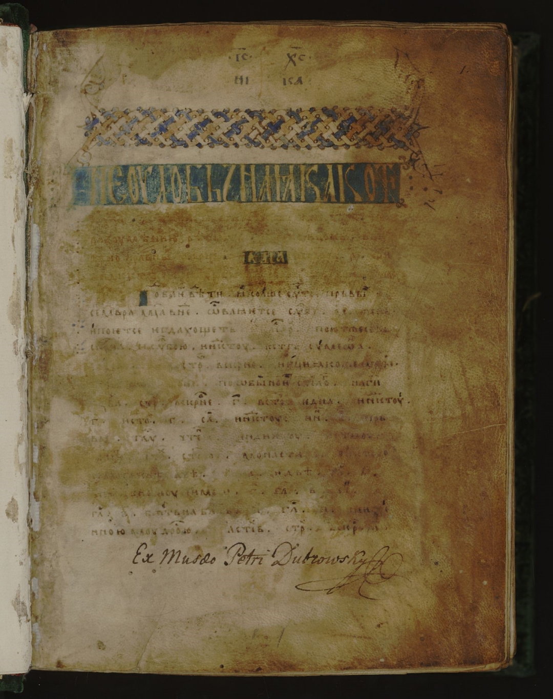 Евангелие апракос полный; Писец Феоктист, монах Хиландарского монастыря. — Афон. Хиландарский монастырь, Середина XIV в. — 1 + II л.; 1º (33,0 × 26,0)