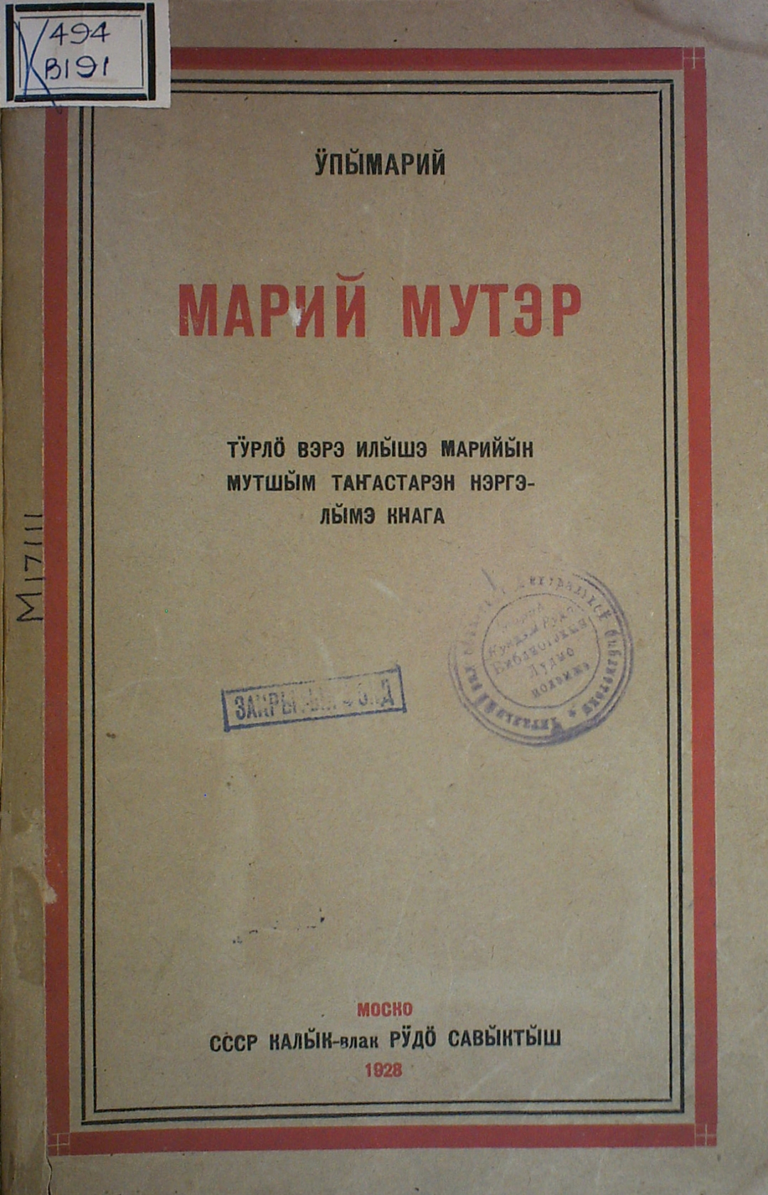 Марий мутэр : тӱрлӧ вэрэ илышэ марийы̆н мутшы̆м таҥастарэн нэргэ лы̆мэ кнага / В. М. Васильев. — Моско: СССР калы̆к-влак рӱдӧ савы̆кты̆ш, 1926. — [1-5], VI-XIII, [1], 15-347, [1]= [348] с.: портр.; 25 см.