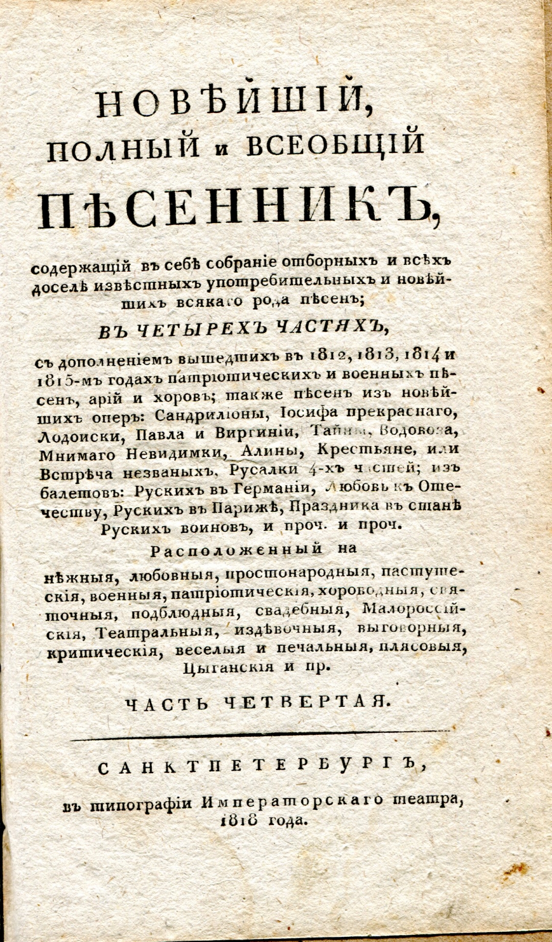 Всеобщий стряпчий, или Ручной судообрядник,: Содержащий в себе : формы, примеры и обряды как и на какой бумаге пишутся, или следует писать, а потом в какие имянно из присутственных мест по установленному законами порядку предъявлять и подавать : частные аттестаты, билеты для пропуска, разныя векселя, верющие, выводные, заемные, обязательные и поступные письма, договоры, доношения, духовныя завещания, ерлыки, аппеляционныя и частныя жалобы, закладныя, и всякаго рода записи и зделки, контракты с казенными местами заключаемые, копии с векселей, купчия, накладныя, объявления, объяснения, отпускные, пашпорты, прошения, росписки, свидетельства и счеты; то есть все такие домашние и крепостные акты, документы и деловыя бумаги, до которых более нежели до других в общежитии бывает нужды. : С присовокуплением к тому: таблицы о процентах, изтолкования книг и слов употребляемых в коммерции, обрядов вотчинных, судных и аппеляционных дел, словеснаго суда, положения о билетах конторы адрессов и новаго таковаго ж о гербовой бумаге, порядка делопроизводства в Правительствующем Сенате и министерстве, разделения губерний на образованныя по высочайшему учреждению и на имеющия особые права для управления, наставления стряпчим и управителям деревень, изложения форм подписываться под повесками, экстрактами и решительными определениями в удовольствии, или не удовольствии, показания судов в Грузии и во вновь приобретенных областях, полнаго описания о российском законодательстве, также о чинах и местах древняго правления : В семи частях / Собранный, сочиненный и по азбучному порядку разположенный Иваном Морковым. — В Санктпетербурге: В Типографии Ивана Глазунова, 1815