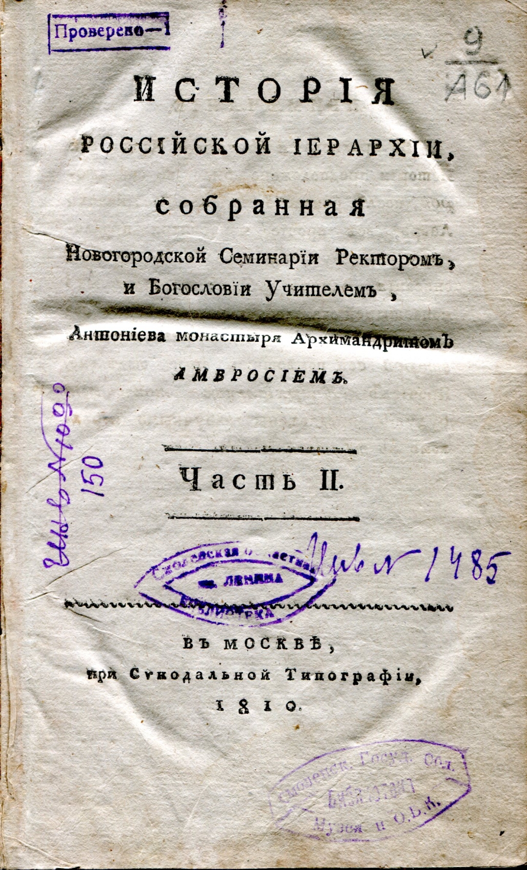 История российской иерархии,: [Ч. 1 - 6] / Собранная Новгородской семинарии префектом, философии учителем, соборным иеромонахом Амвросием . — В Москве: При Синодальной типографии, 1807-1815