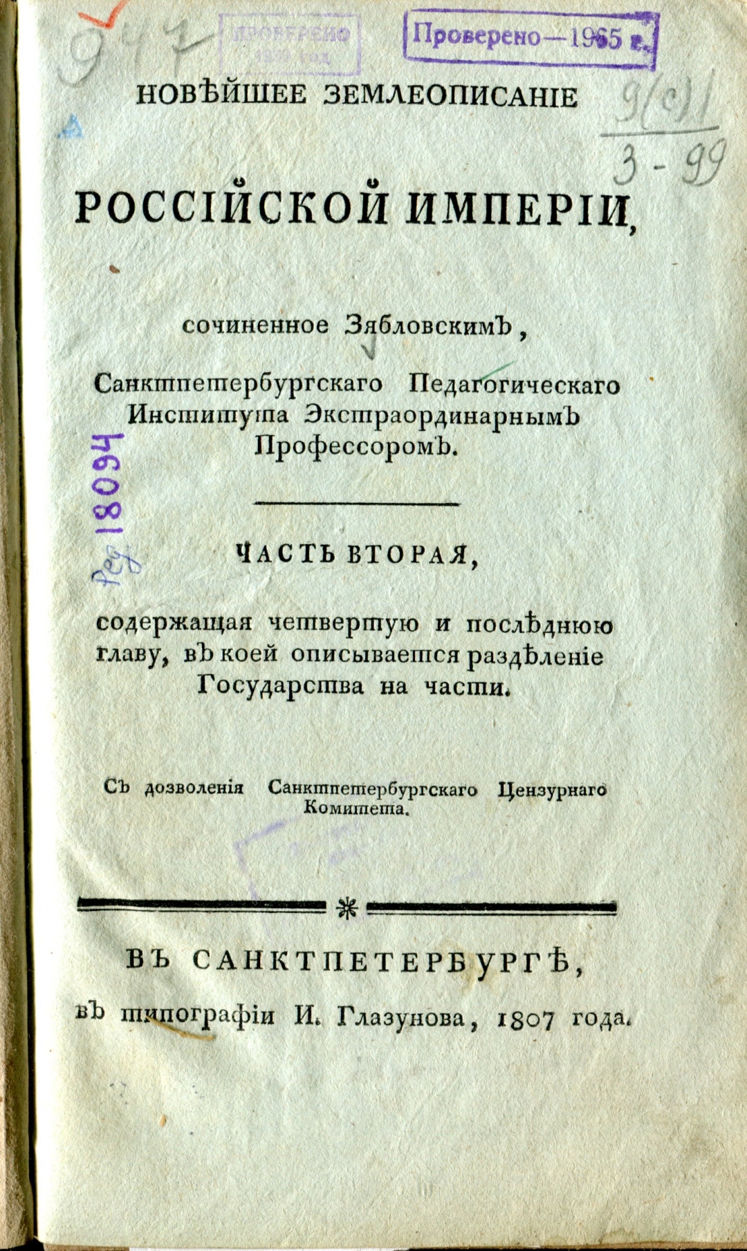 Новейшее землеописание Российской империи, / сочиненное Зябловским, Санктпетербургскаго Педагогическаго института экстраординарным профессором. — В Санктпетербурге: В типографии И. Глазунова, 1807