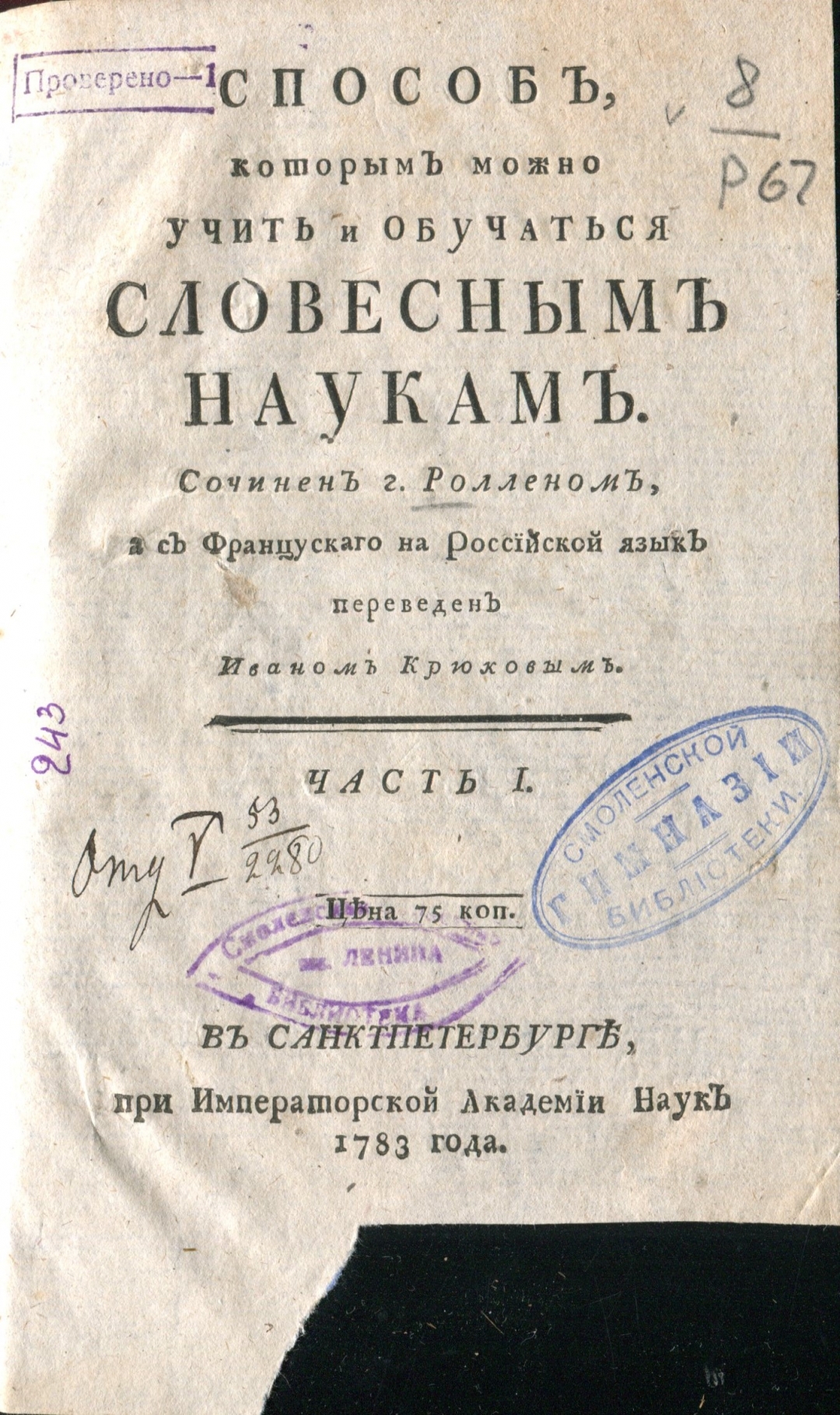 Способ, которым можно учить и обучаться словесным наукам / Сочинен г. Ролленом; а с французскаго на российской язык переведен Иваном Крюковым. — В Санктпетербурге: при Императорской Академии Наук, 1783