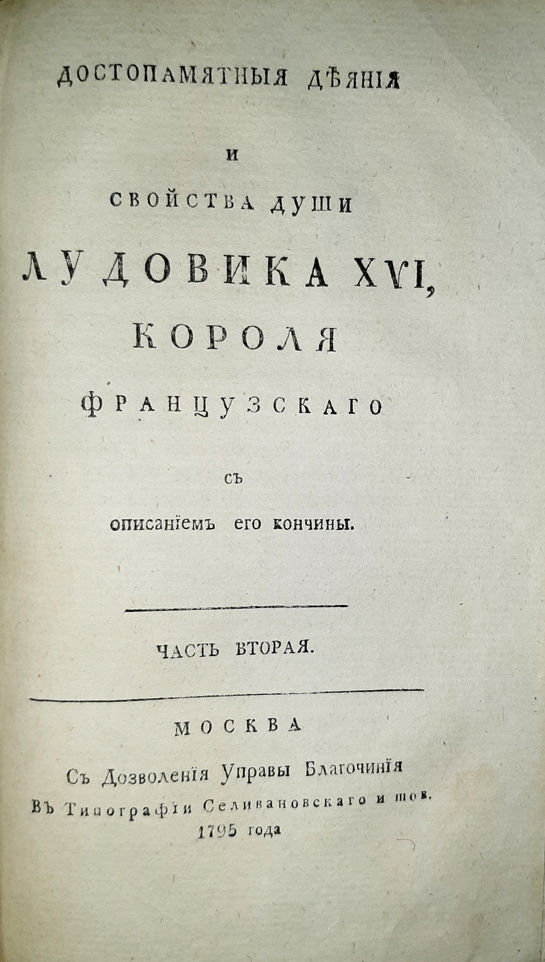 Достопамятныя деяния и свойства души Лудовика XVI, короля французскаго: С описанием его кончины. — Во граде Святого Петра, С дозволения Управы Благочиния: Печатано у И. К. Шнора, 1795