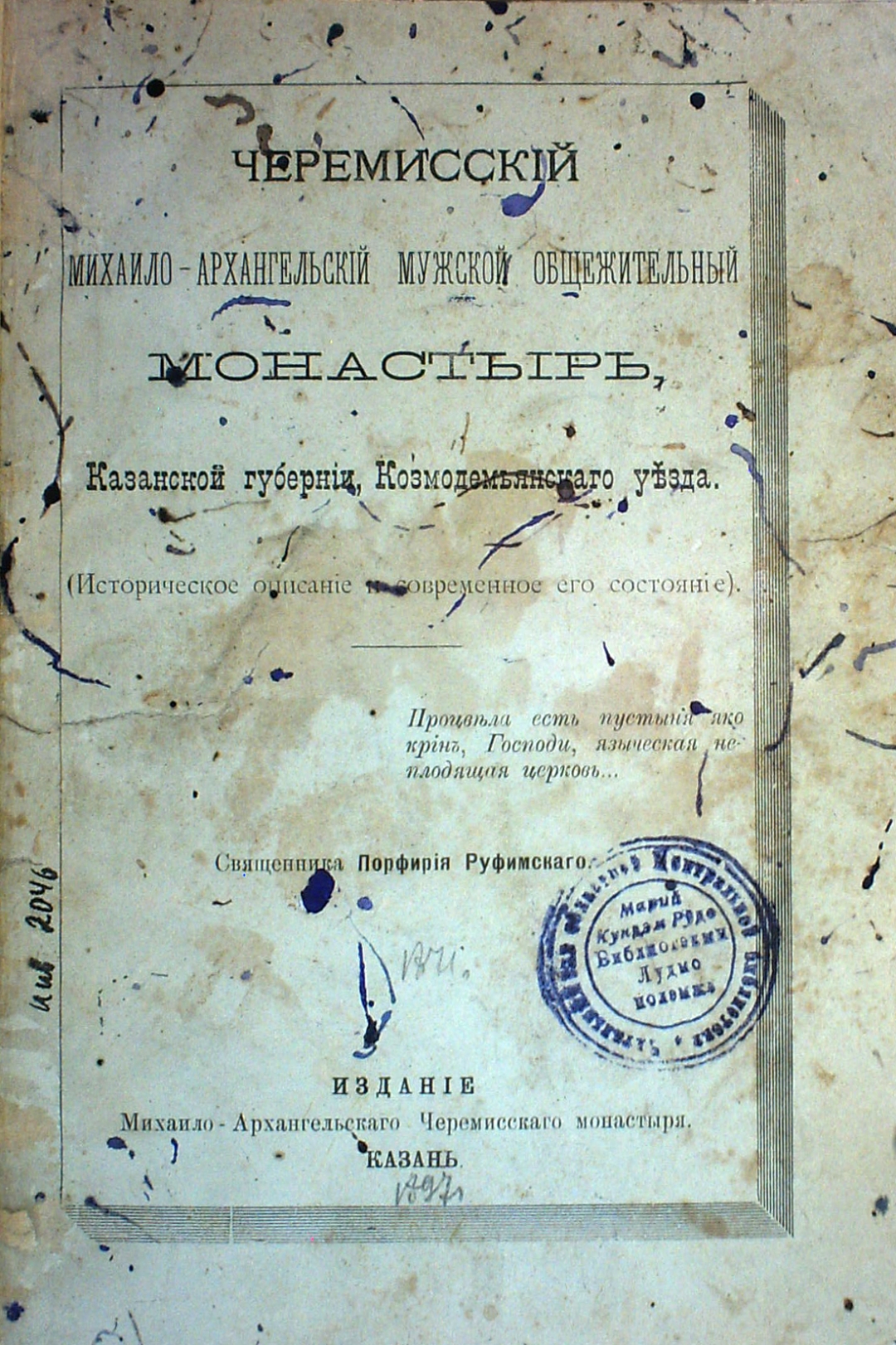 Черемисский Михайло-Архангельский мужской общежительный монастырь, Казанской губернии, Козмодемьянского уезда: Историческое описания и современное его состояние / [Сочинение] Священника Порфирия Руфимского. — Казань : Издание Михаило-Архангельскаго Черемисскаго монастыря, 1897. — [6], 170, III с., : 9 л. ил.; 25 см.
