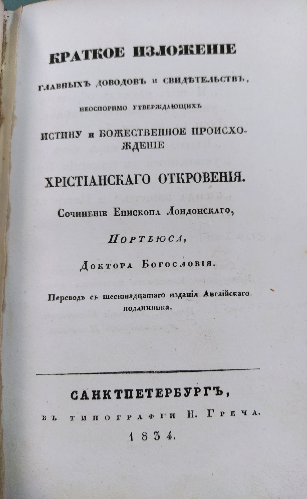 Краткое изложение главных доводов и свидетельств, неоспоримо утверждающих истину и божественное начало христианского откровения / Соч. епископа лондонского Портьюса, д-ра богословия; Пер. с шестнадцатого издания английского подлинника [Я. Бардовского]. — Санкт-Петербург: тип. Н. Греча, 1834. — XXII, 182 с.; 20 см