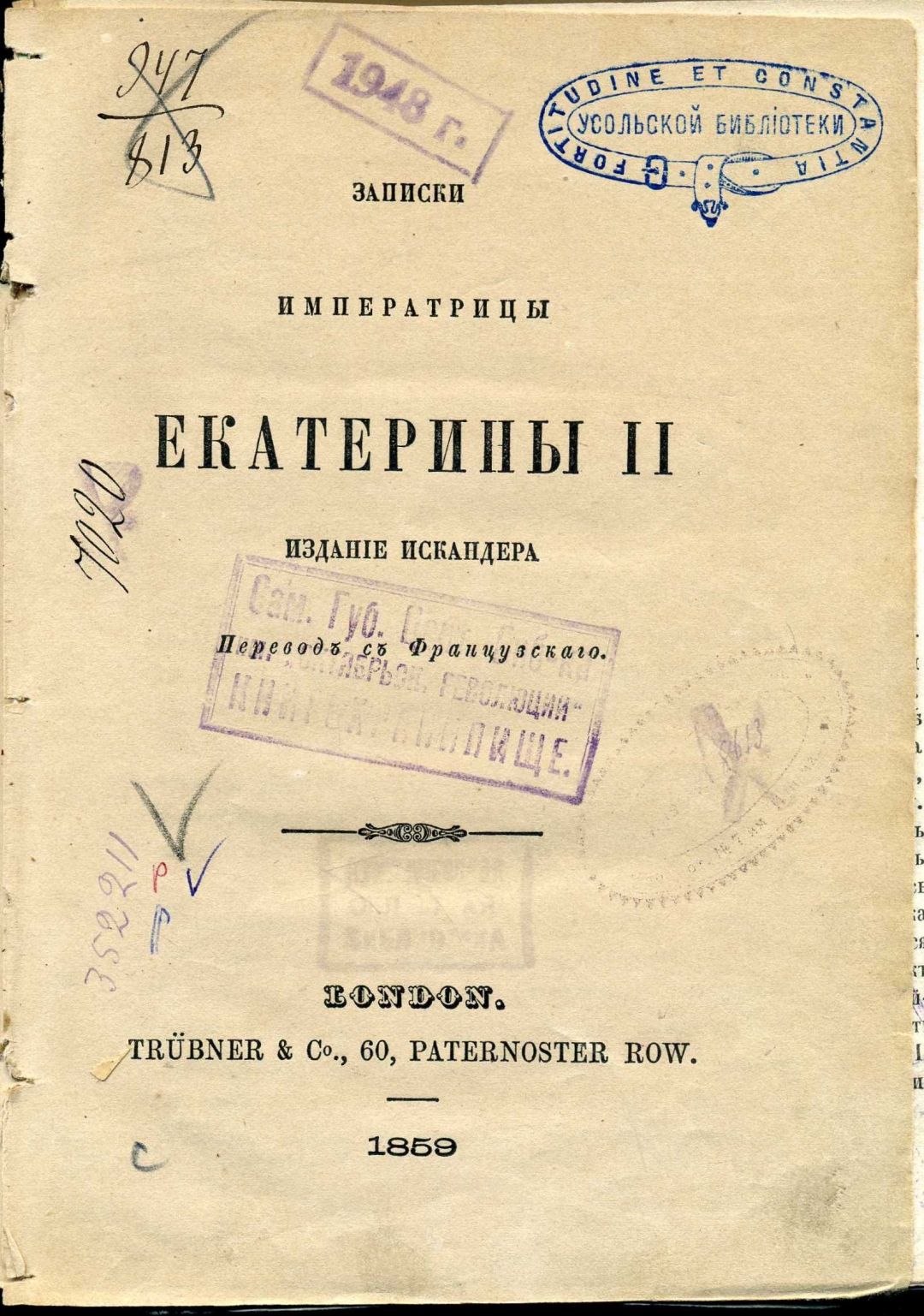 Записки императрицы Екатерины II / Изд. Искандера [А. И. Герцена] ; перевод с французского [и предисловие П.И. Бартенева]. — London: Trübner & Co., 1859. — VIII, 279, [1] с.; 8°