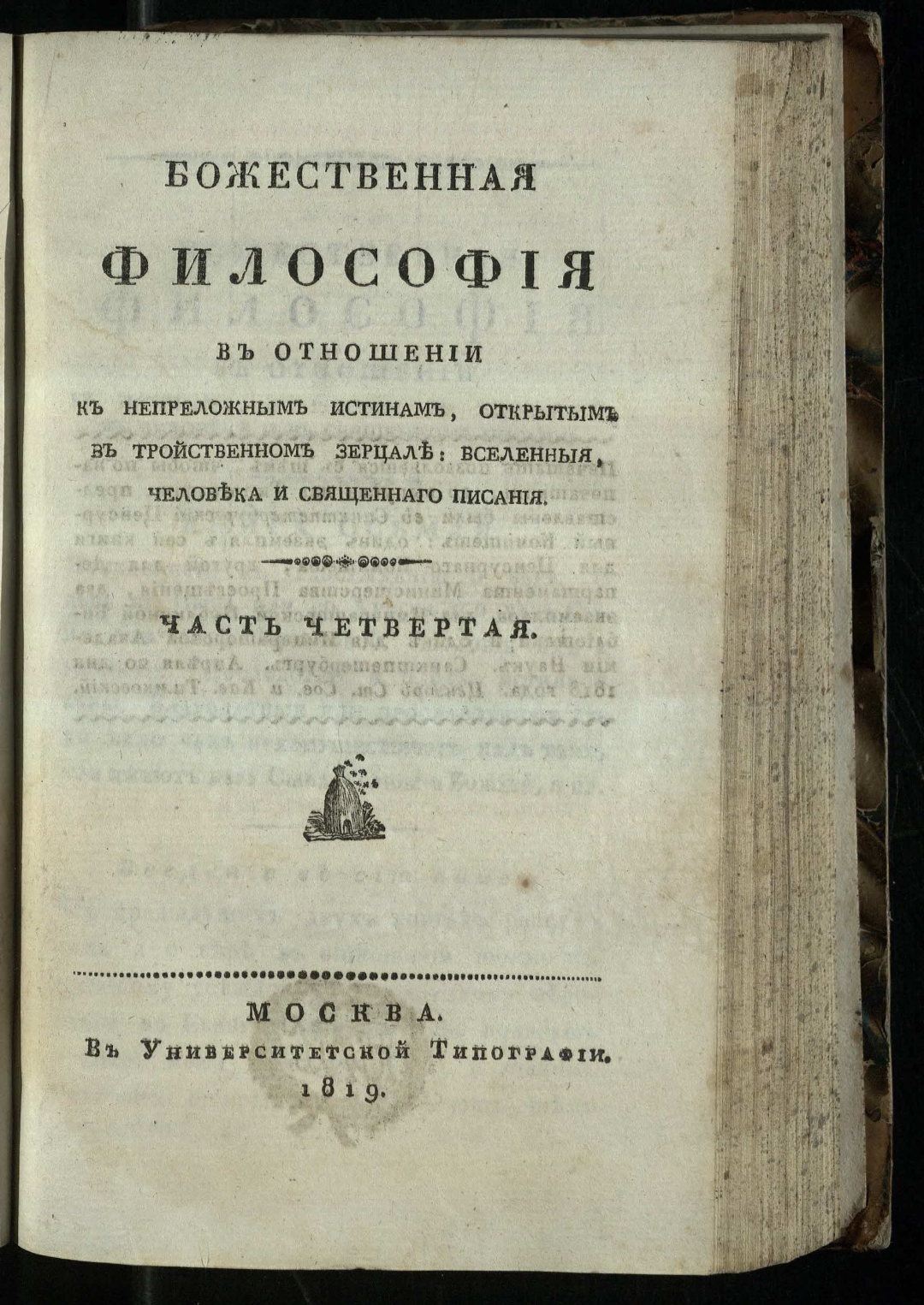 Божественная философия в отношении к непреложным истинам, открытым в тройственном зерцале: вселенныя, человека и Священнаго писания. . — Москва: В Университетской типографии, 1818-1819