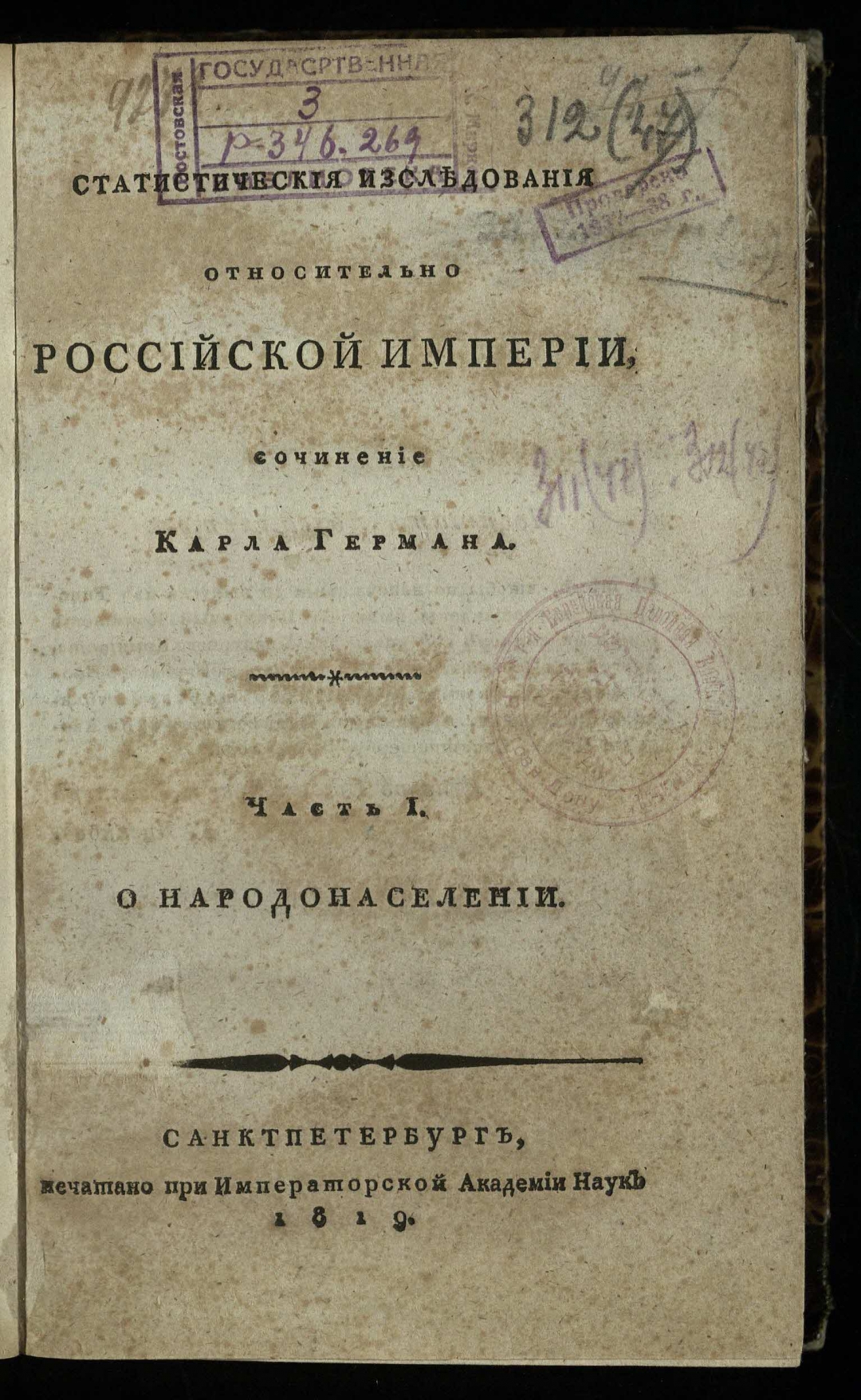 Статистическия изследования относительно Российской империи, / Сочинение Карла Германа. — Санктпетербург: печатано при Императорской Академии наук, 1819