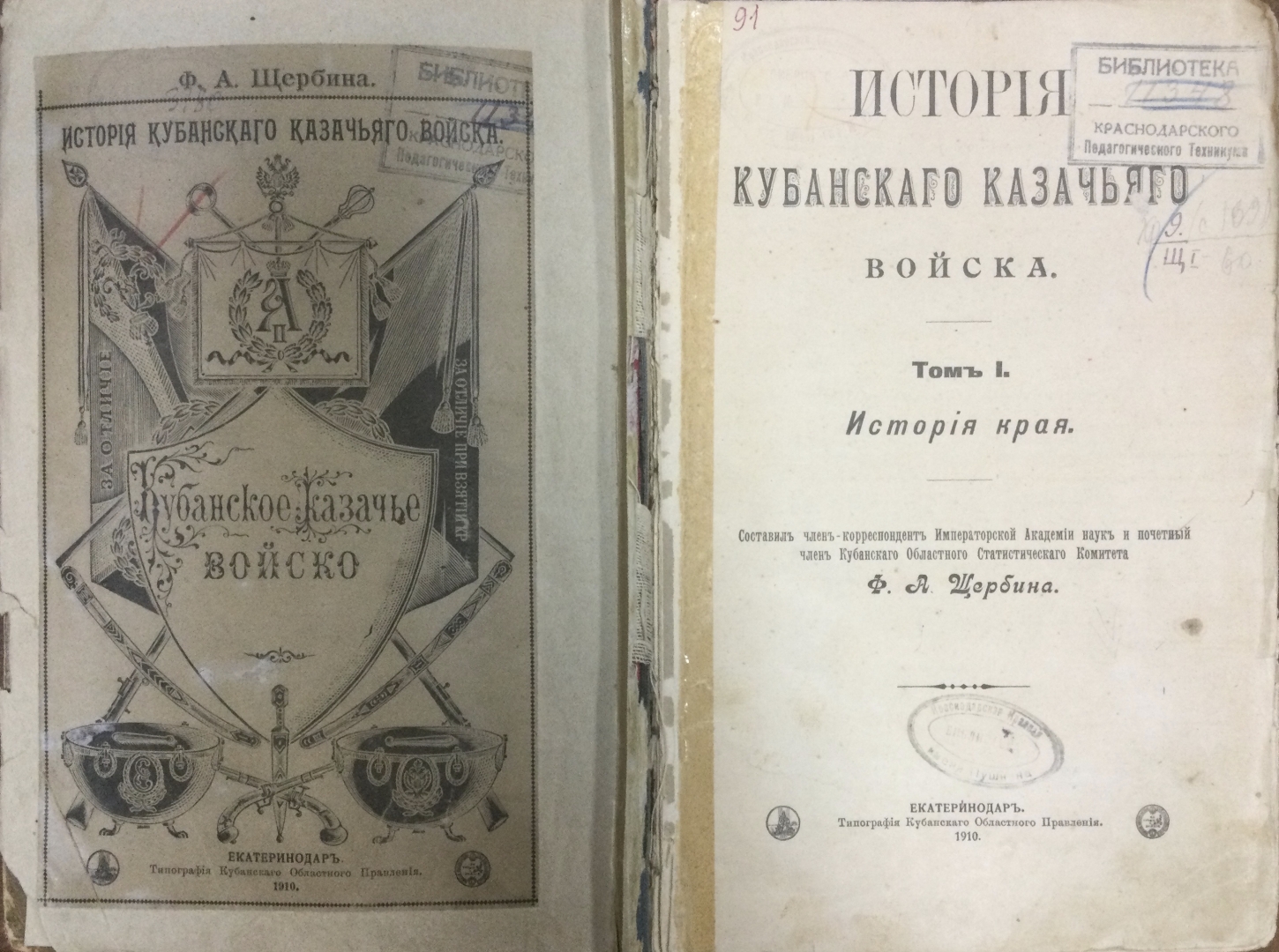 История Кубанского казачьего войска / составил член-корреспондент Императорской академии наук и почетный член Кубанского областного правления Ф. А. Щербина. — Екатеринодар: Тип. Кубанского областного правления, 1910-1913