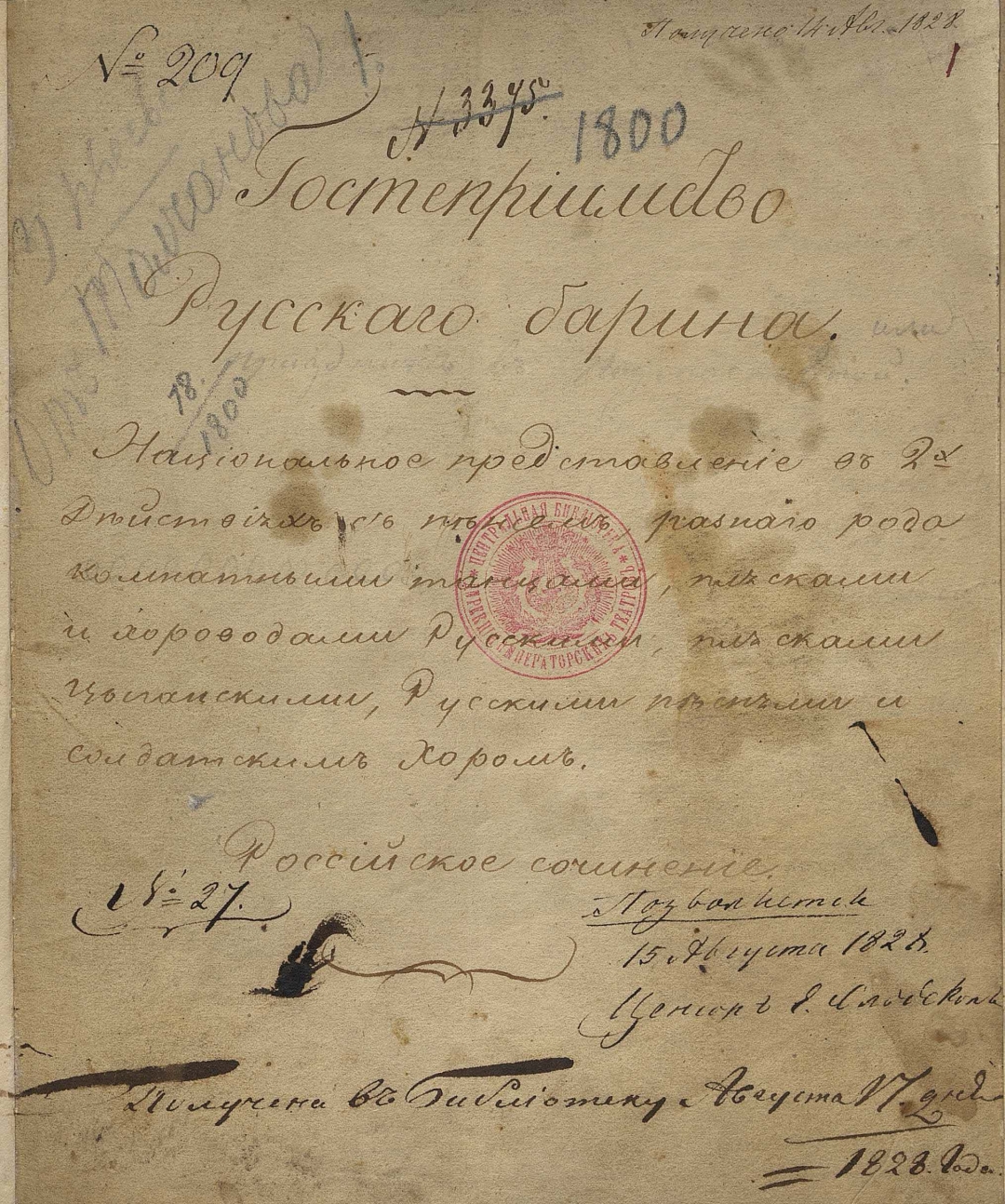 Гостеприимство русского барина: нац. представление в 2 д. с пением, разного рода комнатными танцами, плясками и хороводами русскими, плясками цыганскими, русскими песнями и солдатским хором ; Российское соч. / С. И. Висковатов. — [Санкт-Петербург], [1828]. — 29 с.; 22,2х18,0х0,6