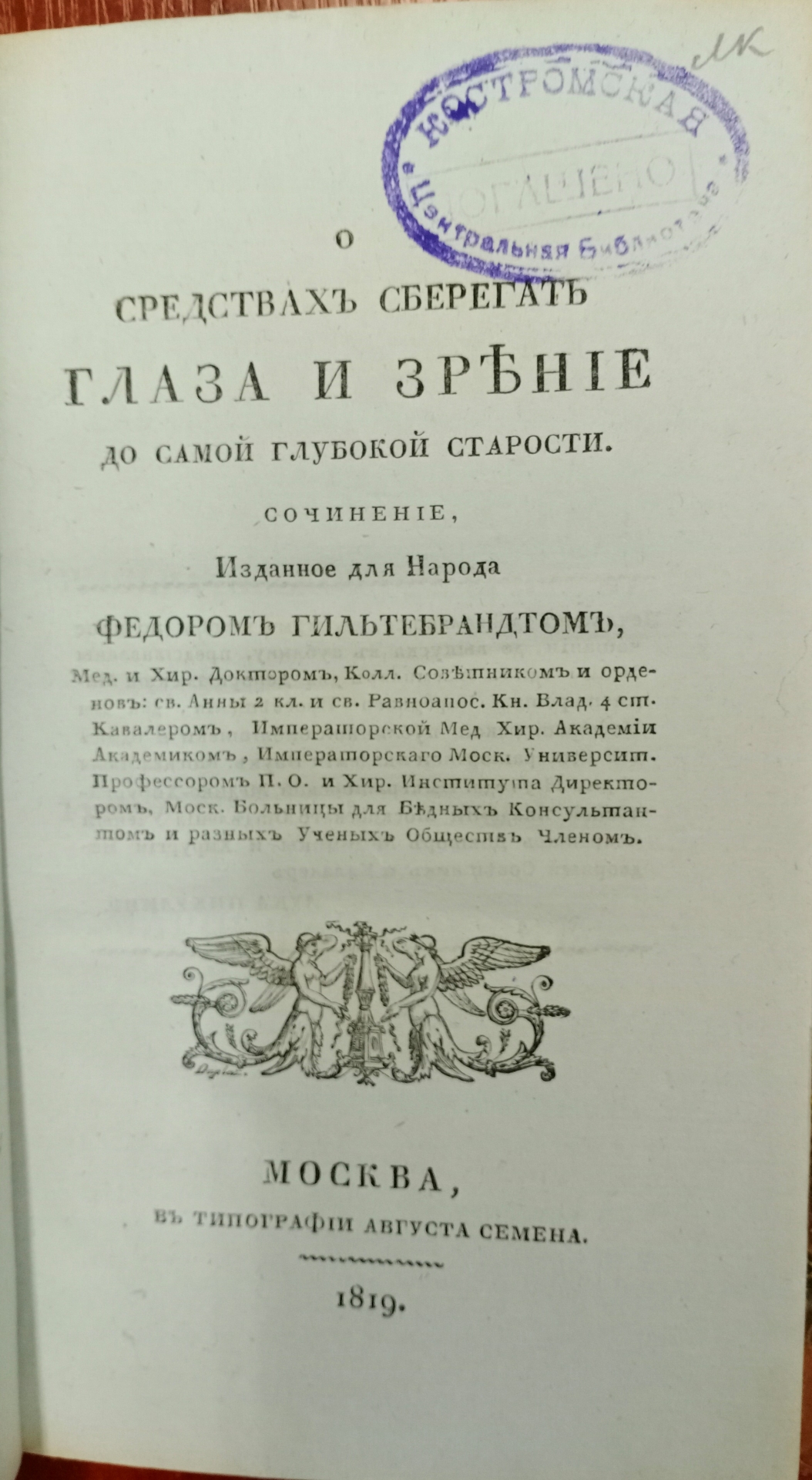 О средствах сберегать глаза и зрение до самой глубокой старости. / Сочинение, изданное для народа Федором Гилтебрандтом, мед. и хир. доктором, колл. советником и орденов: св. Анны 2 кл. и св. равноапос. кн. Влад. 4 ст. кавалером, Императорской Мед. хир. академии академиком, Императорскаго Моск. университ. профессором п. о. и Хир. института директором, Моск. больницы для бедных консультантом и разных ученых обществ членом. — Москва: в типографии Августа Семена, 1819. — XVI, 162, [2] с., [1] л. черт. ; 8° (20 с.)