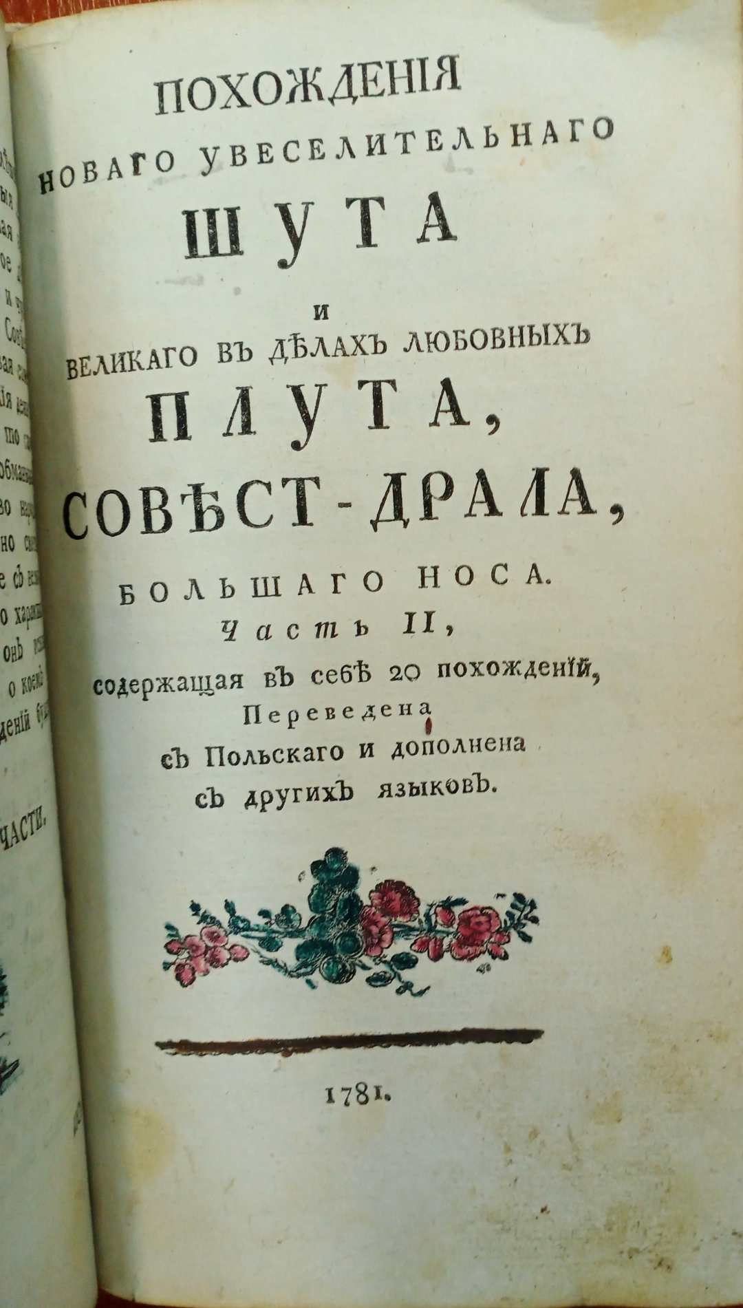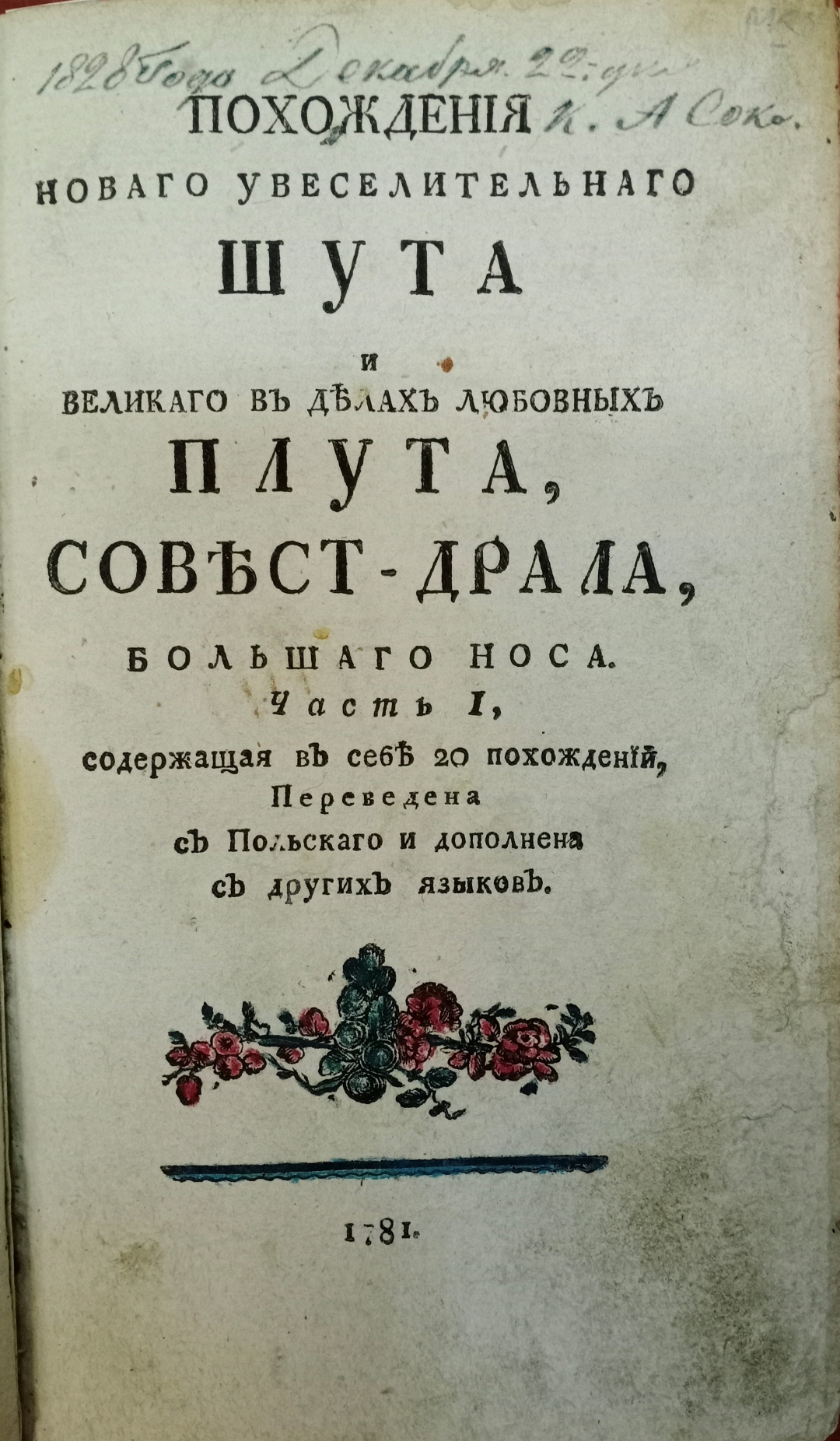 Похождения новаго увеселительнаго шута и великаго в делах любовных плута, Совест-Драла, Большаго Носа. : Переведена с польскаго и дополнена с других языков. — [Москва] : [Сенатская типография], 1781