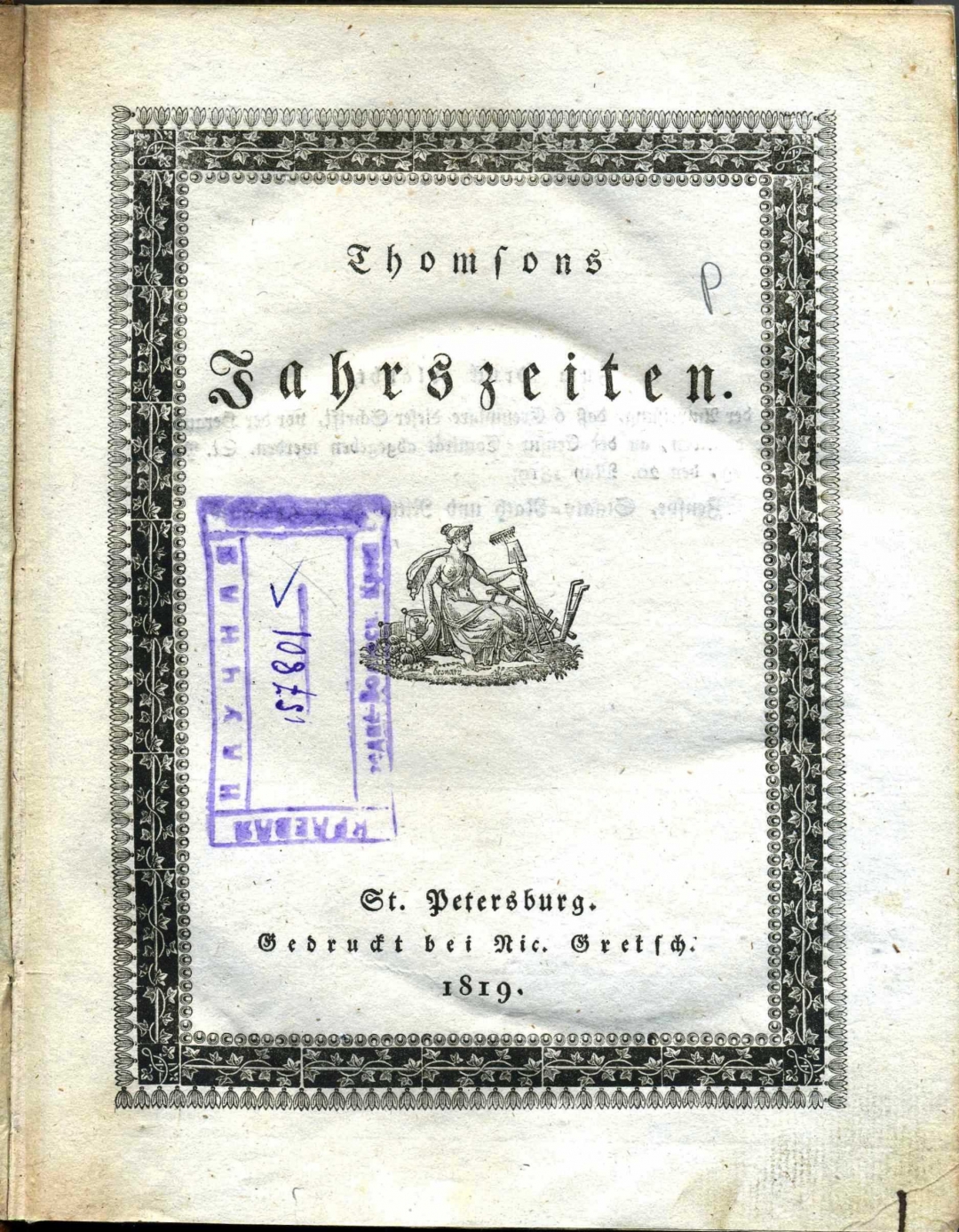 Thomsons Jahrszeiten. — St. Petersbourg: Gedruckt bei Nic. Gretsch, 1819. — [2], 521, [1] S.; 4°