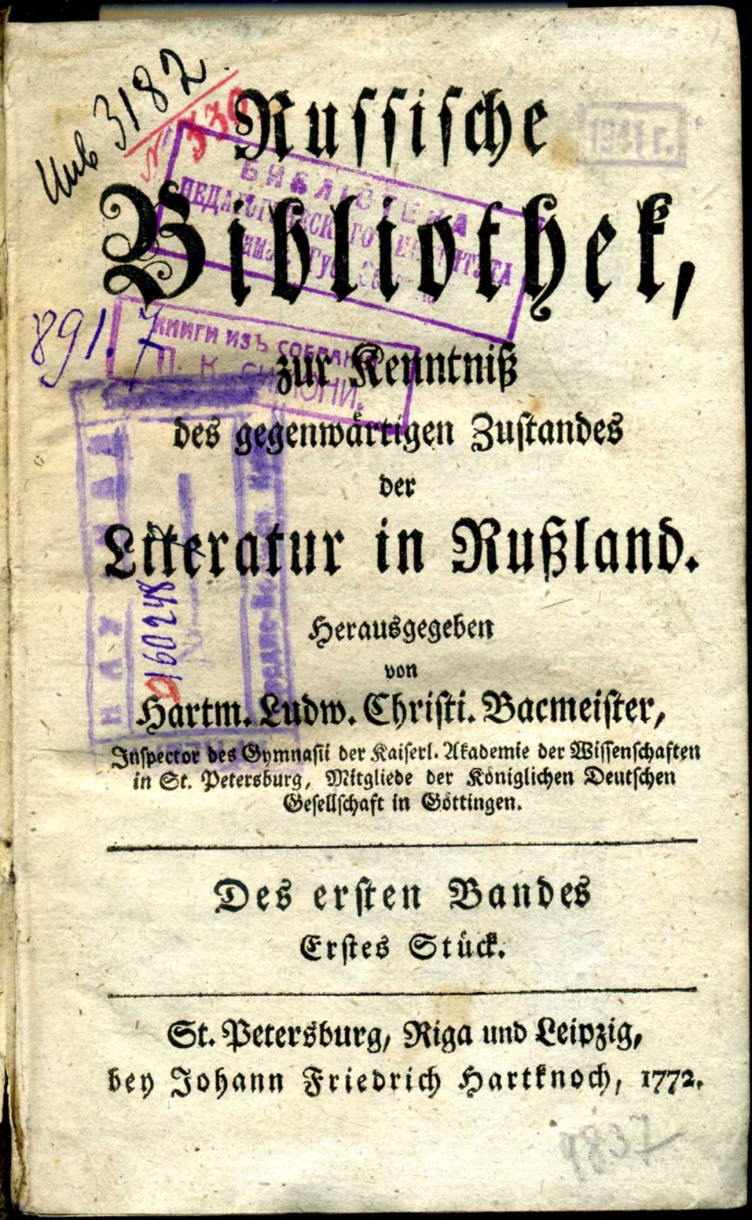 Russische Bibliothek,: zur Kenntniss des gegenwärtigen Zustandes der Literatur in Russland / Herausgegeben von Hartwig Ludwig Christian Bacmeister,; Mitgliede der Königlichen Deutschen Gesellschaft in Göttingen. — St. Petersburg, Riga und Leipzig: bey Johann Friedrich Hartknoch, 1772 - 1787