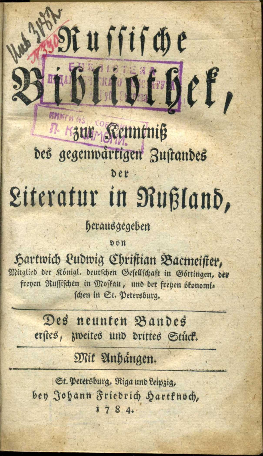 Russische Bibliothek,: zur Kenntniss des gegenwärtigen Zustandes der Literatur in Russland / Herausgegeben von Hartwig Ludwig Christian Bacmeister,; Mitgliede der Königlichen Deutschen Gesellschaft in Göttingen. — St. Petersburg, Riga und Leipzig: bey Johann Friedrich Hartknoch, 1772 - 1787