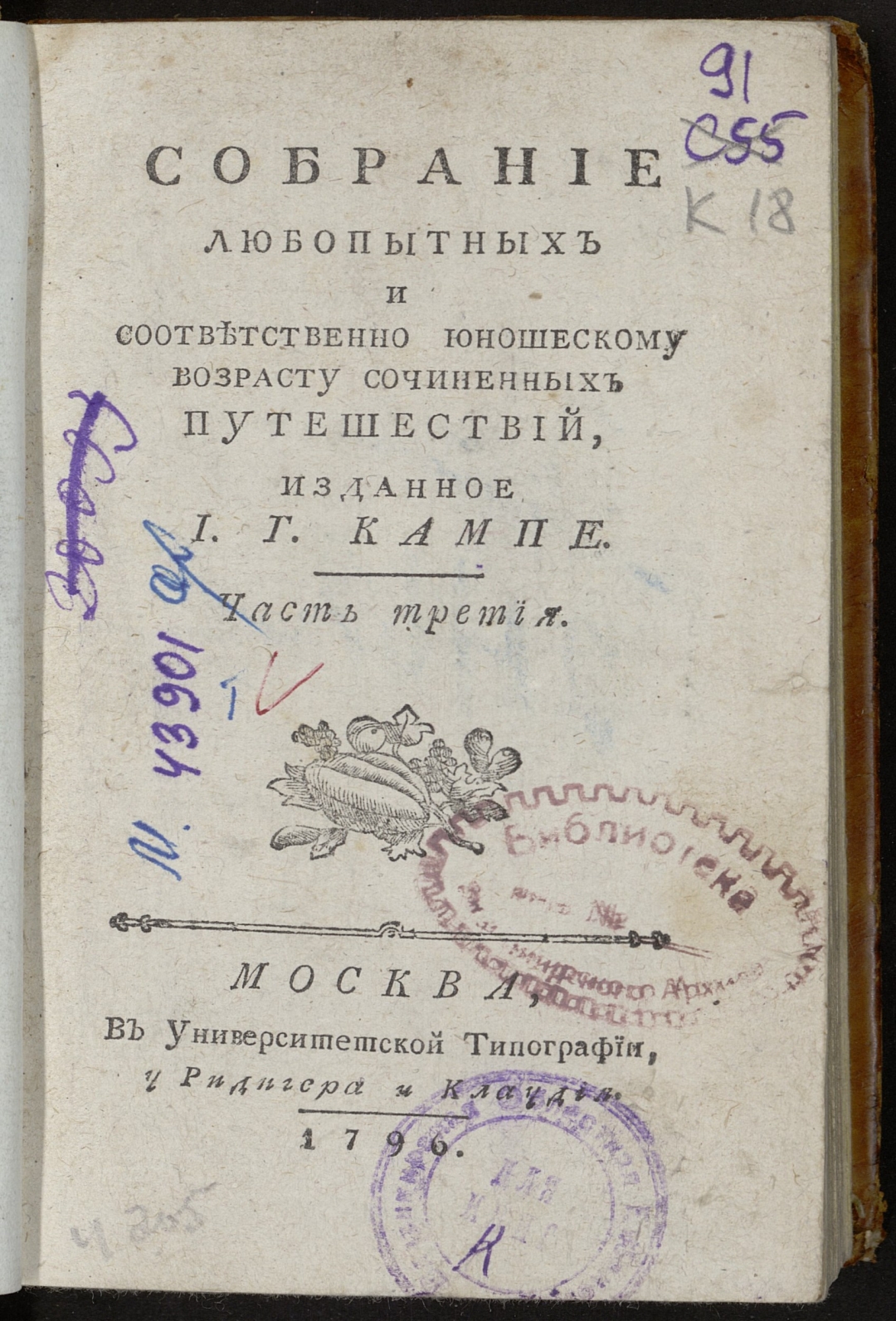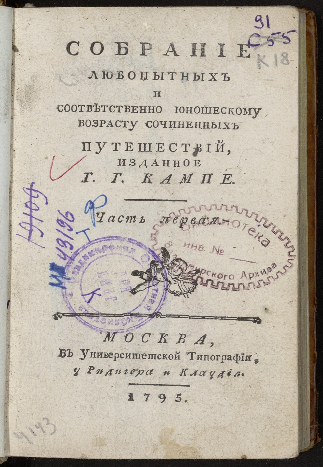 Собрание любопытных и сответственно юношескому возрасту сочиненных путешествий / Изданное Г. Г. Кампе. — В Москве: В университетской типографии, у Ридигера и Клаудия, 1796