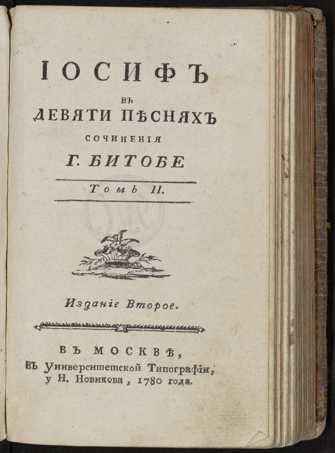 Иосиф: В девяти песнях; Сочинения г. Битобе , [Перевел Д.И. Фонвизин]. — В Москве: В Университетской типографии у Н. Новикова, 1780