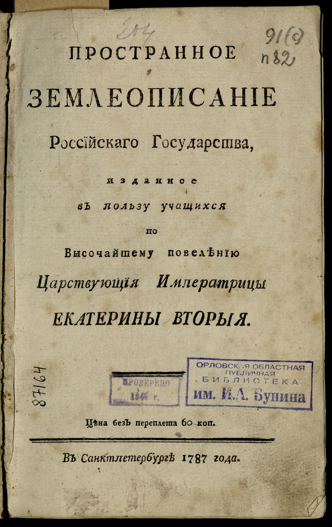 Пространное землеописание Российскаго государства : Изданное в пользу учащихся по высочайшему повелению царствующия императрицы Екатерины Вторыя. — Санктпетербург : [Тип. Брейткопфа], 1787. — [8], 420 с.: 9 л. карт; 8°
