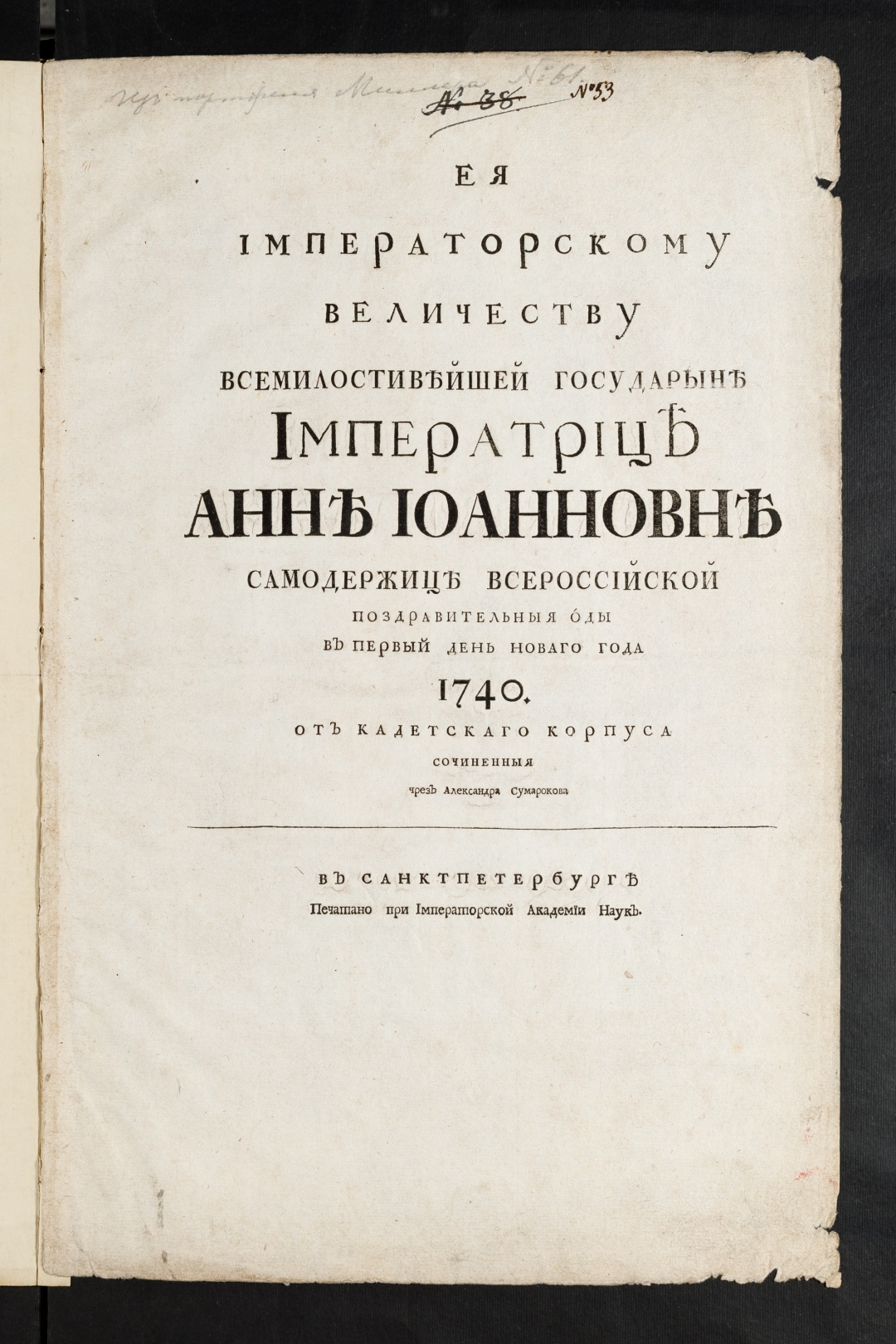 Ея императорскому величеству всемилостивейшей государыне императрице Анне Иоанновне самодержице всероссийской поздравительныя оды в первый день новаго года 1740 от Кадетскаго корпуса / Сочиненныя чрез Александра Сумарокова. — В Санктпетербурге: Печатано при Императорской Академии наук, [1740]. — [10] с.; 2°