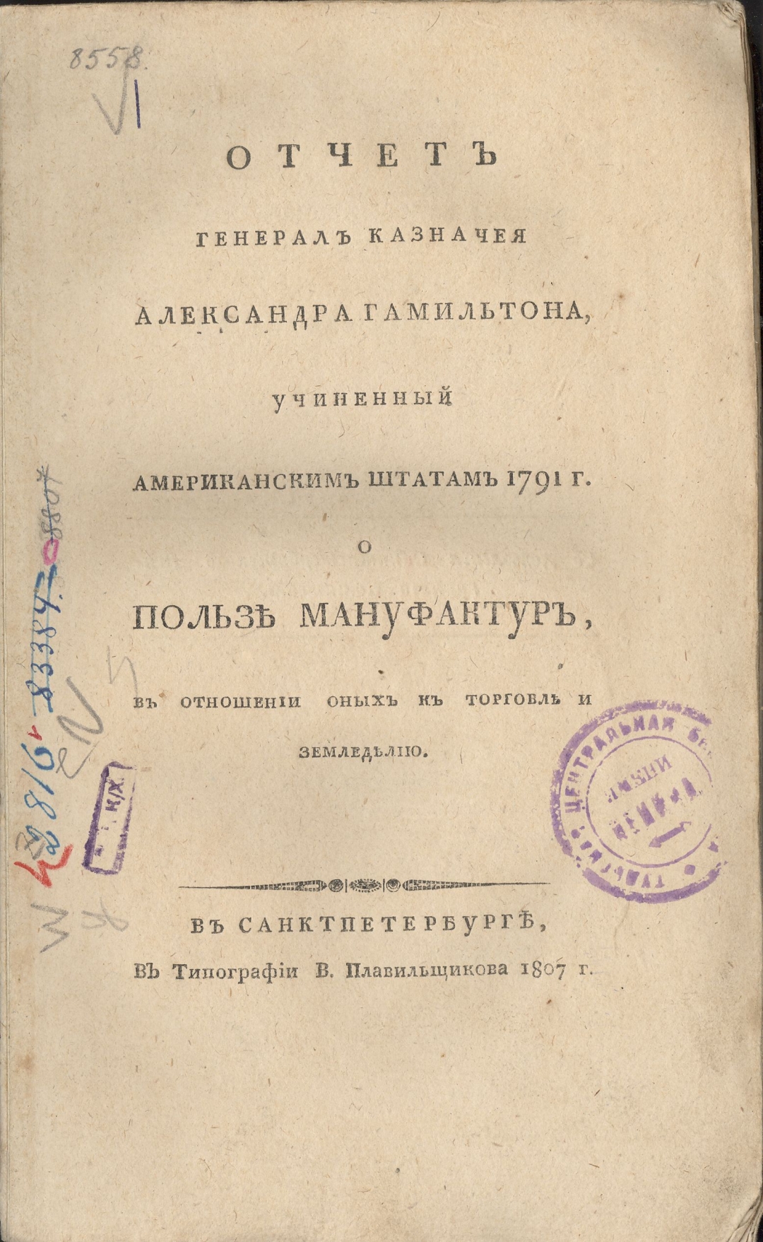 Отчет генерал казначея Александра Гамильтона, учиненный Американским штатам 1791 г. о пользе мануфактур, в отношении оных к торговле и земледелию. — В Санктпетербурге: В типографии В. Плавильщикова, 1807. — [4], II, 162 с.; 8° (22 см)