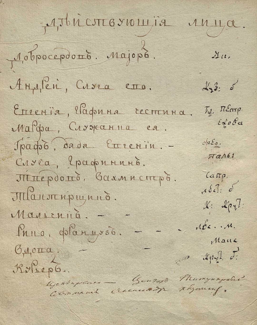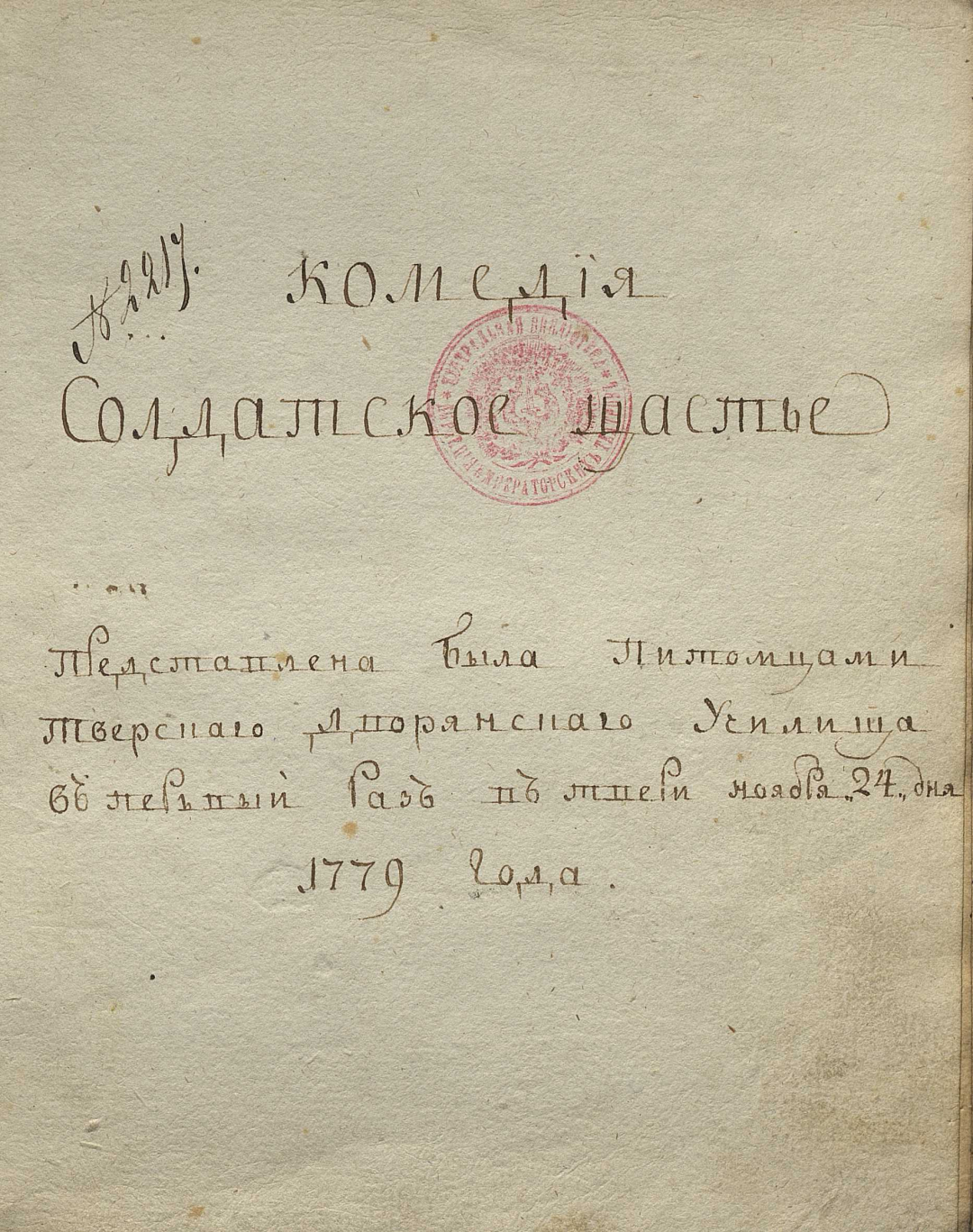 Рабочий экз.; Премьера 1779 г. 24 ноября в Твери учащимися Тверского дворянского училища; Исполнители; Цензурное разрешение