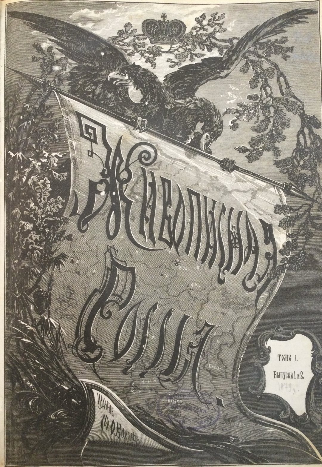 Составной переплет: корешок - кожа, крышки - коричневый коленкор, на верхней крышке - надпись тиснением "Живописная Россия" Т. 1. Выпуски 1 и 2. 1879 г. Сохранена издательская обложка работы Н. Каразина