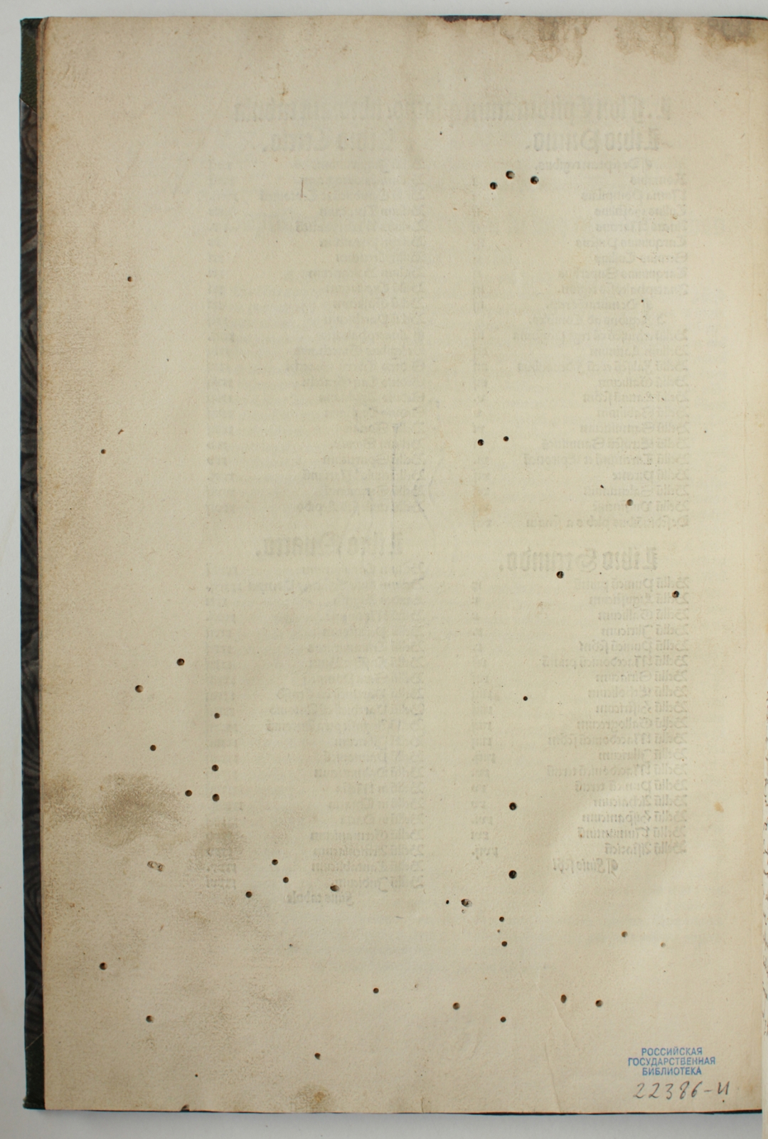 Отверстия от насекомых по всему книжному блоку, пятна и загрязнения на отдельных листах