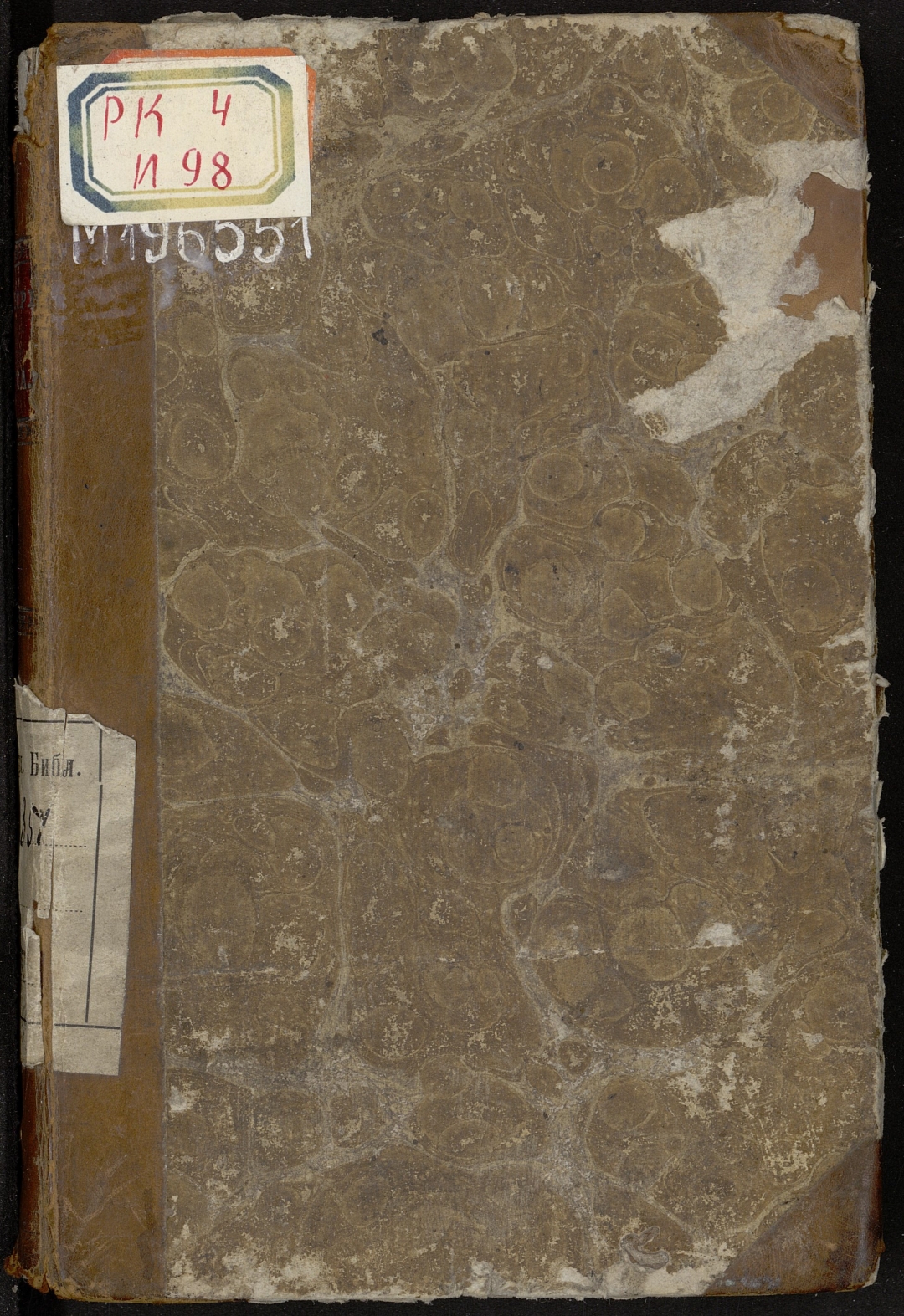Потертости обеих крышек переплета и корешка. Утраты кожи на верхней и нижней части корешка, уголках. Утраты мраморной бумаги на крышках переплета. Отсутствует титульный лист, с. 172, 173, 1 л. ил. Незначительная деформация листов по всему книжному блоку.