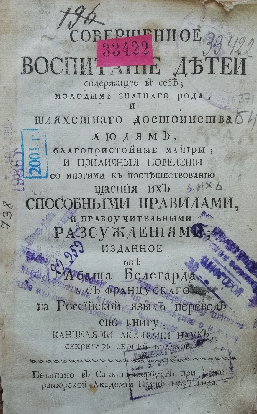Пометы: на форзаце (черные чернила); на титульном листе (карандаш, синие чернила, черные чернила); на с. 17 (синие чернила); на нахзаце (красный карандаш).