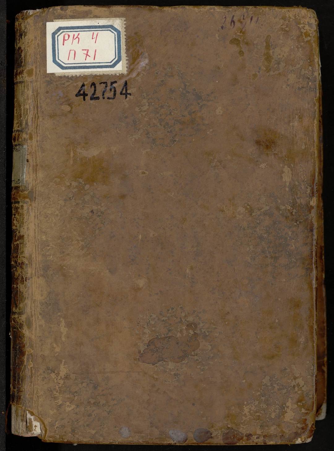 Потертости обеих крышек переплета и корешка. Небольшие утраты кожи на вершней и нижней части корешка и на уголках переплета. Незначительная деформация листов по всему книжному блоку. Отсутствуют 2 л. ил. На задней крышке переплета ходы насекомых.