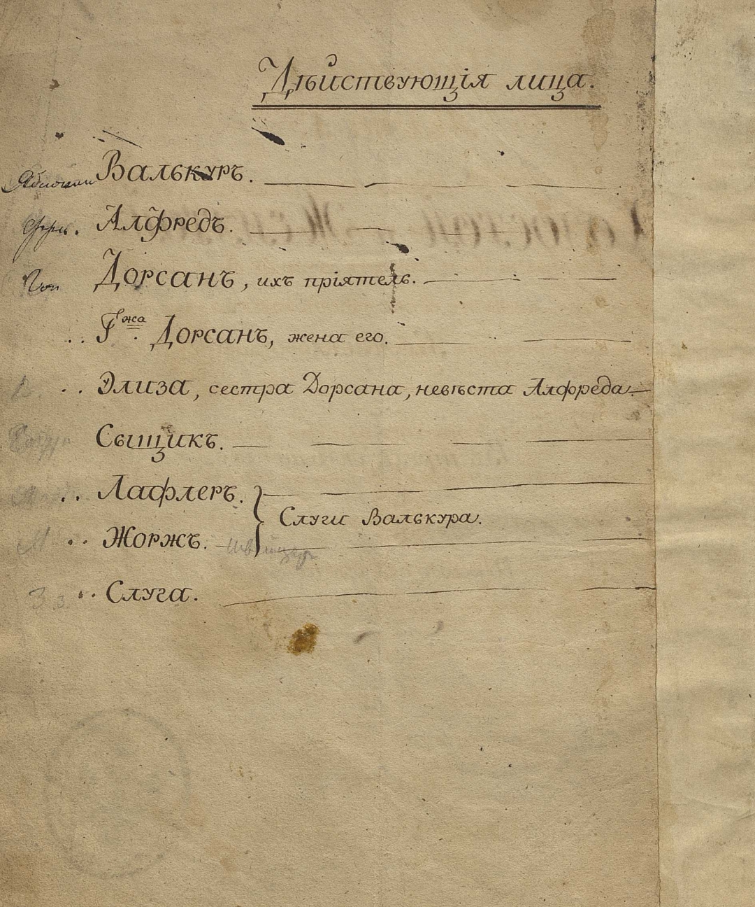 Рабочий экз.; Суфлерский экз.; Исполнители; Цензурное разрешение 1823 г. 15 сентября