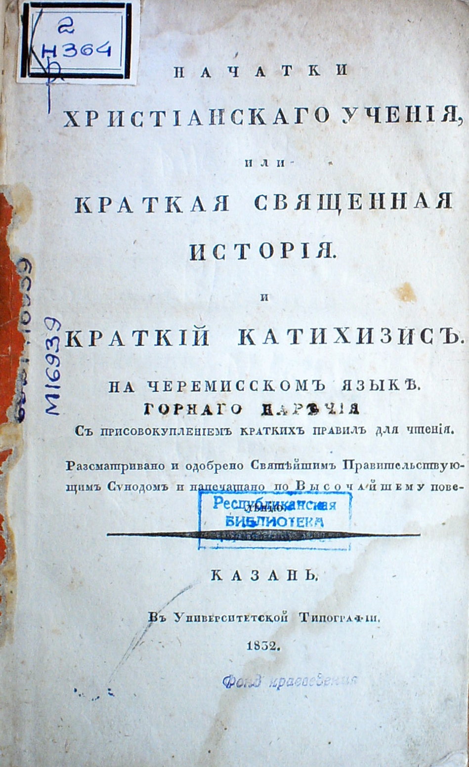 Экземпляр в новом переплёте. На обложке : "Краткая Священная история и Краткий катихизисъ"