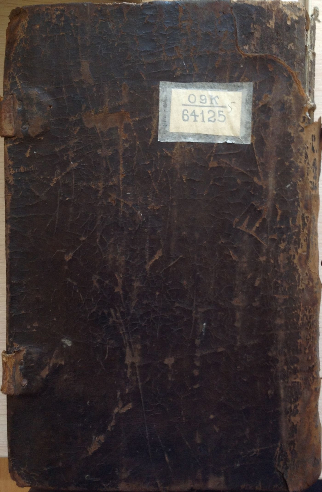 Переплет нач. 19 в. – доски в потертой растрескавшейся коже с тиснением. Застежки утрачены, сохранились два спенька.