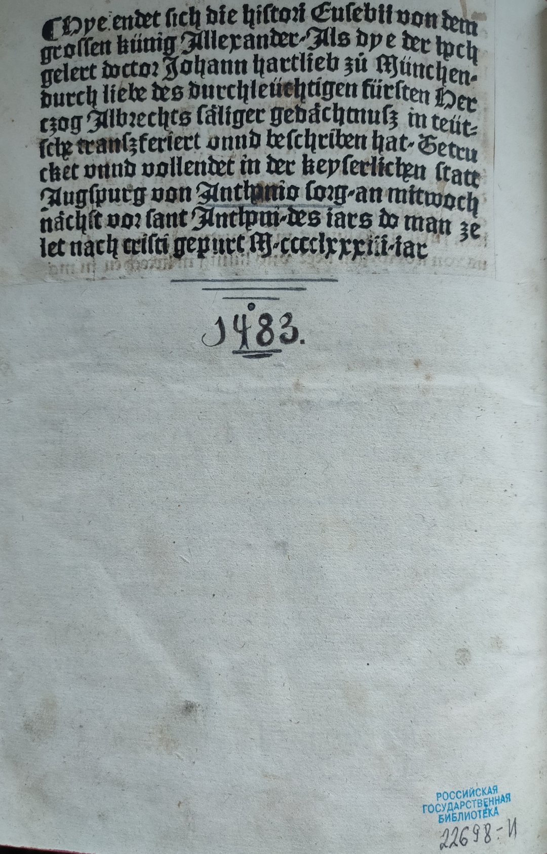 отсутствующие л. 62, 69, 99 (по карандашной сквозной нумерации) восполнены в XIX в. (?) факсимильными копиями. Гравюры и гравированный на дереве инициал в начале книги раскрашены от руки. Переплёт второй половины XIX в.