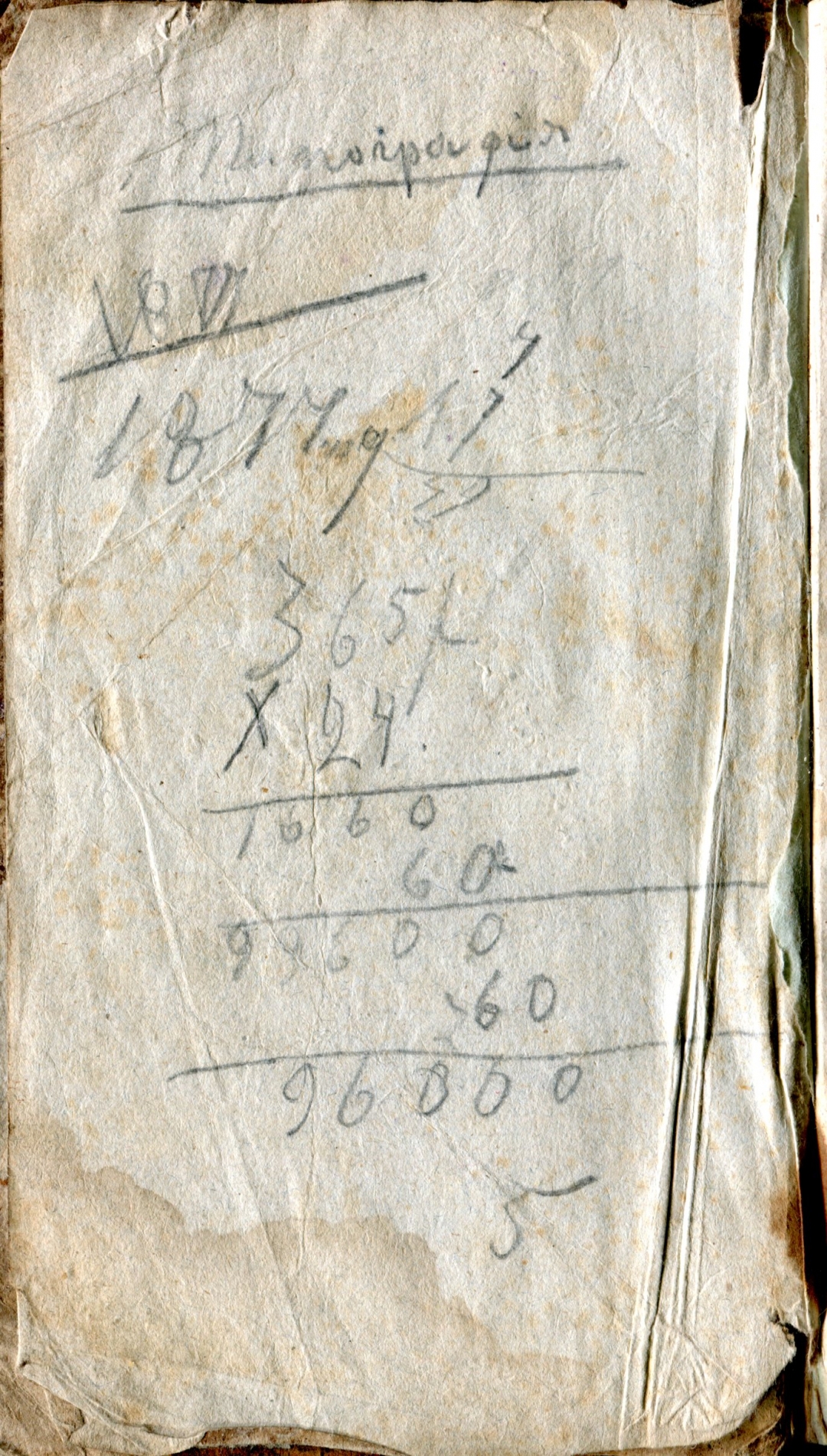 Пометы: на верхней крышке переплета (тушь); на титульном листе (карандаш, цв. карандаш, чернила); на с. 17 (чернила); на нахзаце (шариковая ручка).