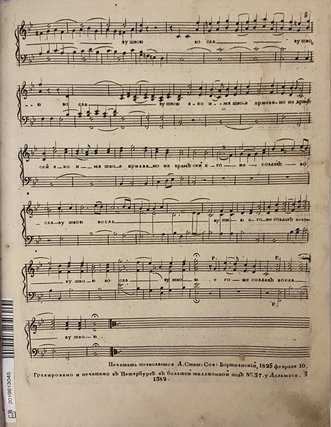 Грав. ноты (оттиск 28,0х21,5 см); Аллиг. 4, припл. к: Бортнянский Д. С. Концерт [№22]: «Господь просвещение мое». СПб., [1825].