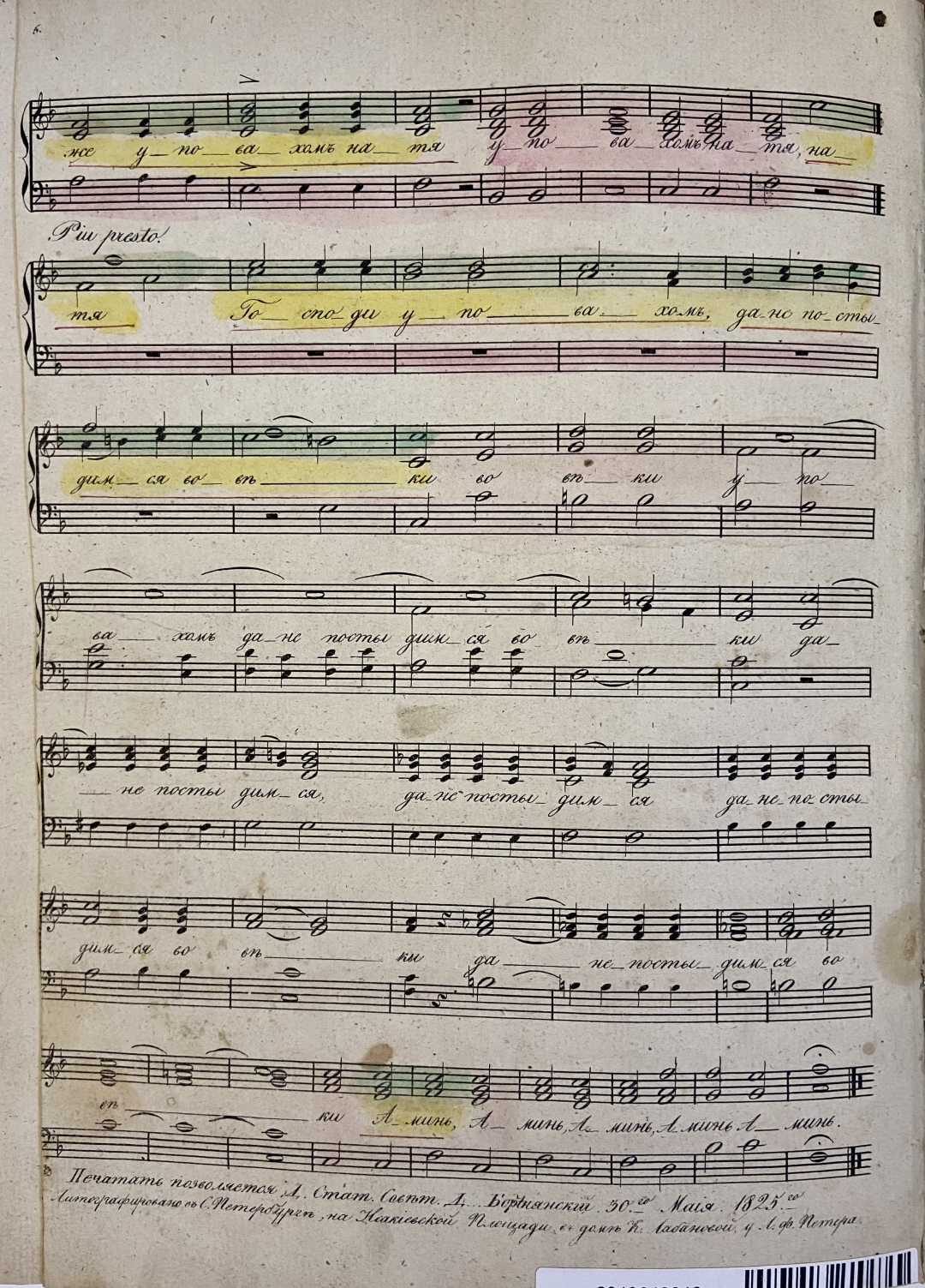 Аллиг. 15, припл. к: Бортнянский Д. С. Концерт [№22]: «Господь просвещение мое». СПб., [1825]. Раскрашенные нотные строчки и лит. текст; правая сторона всех страниц срезана