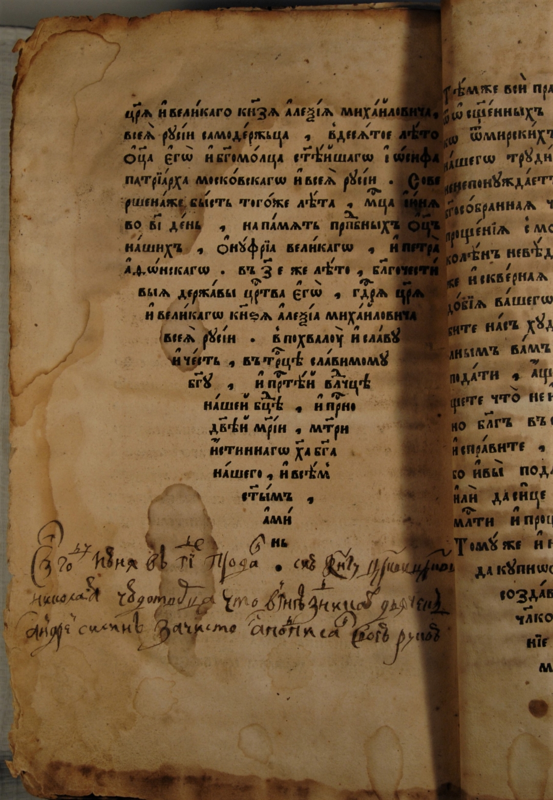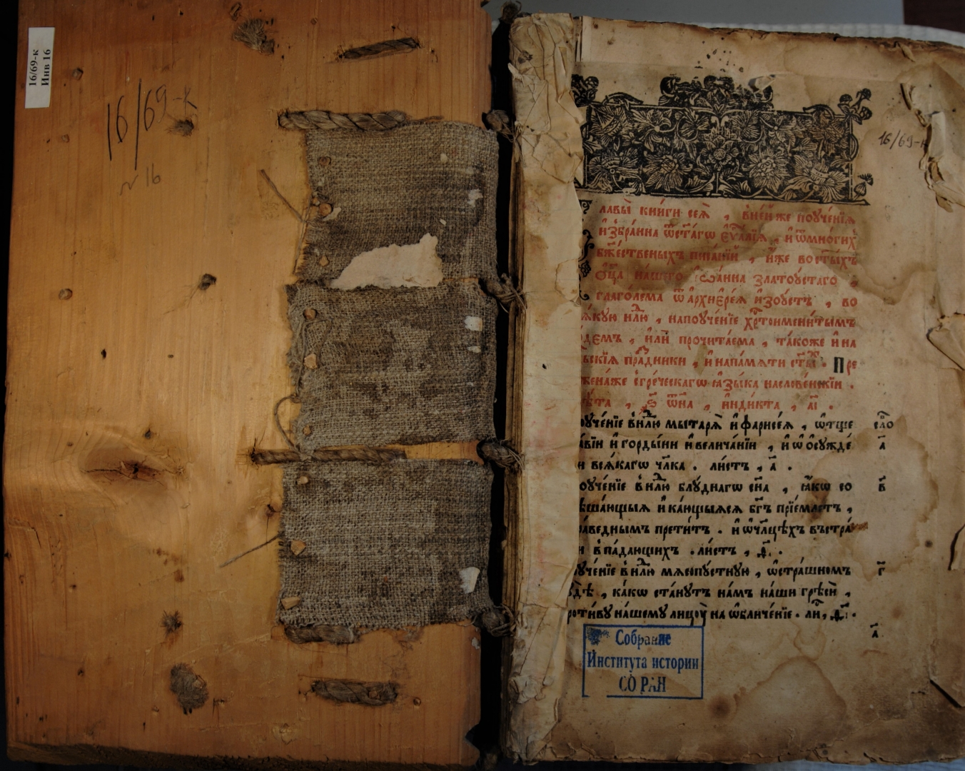 В конце книги – рукописная вставка на шести листах полууставом на бумаге с филигранью: «Рrо Раtria» с литерами РS и БКФ (Клепиков I, № 90. 1768 г.): «От книги Маргита (!) от жития Пречистыя Богородицы». Блок незначительно реставрирован бумагой XIX–XX вв.